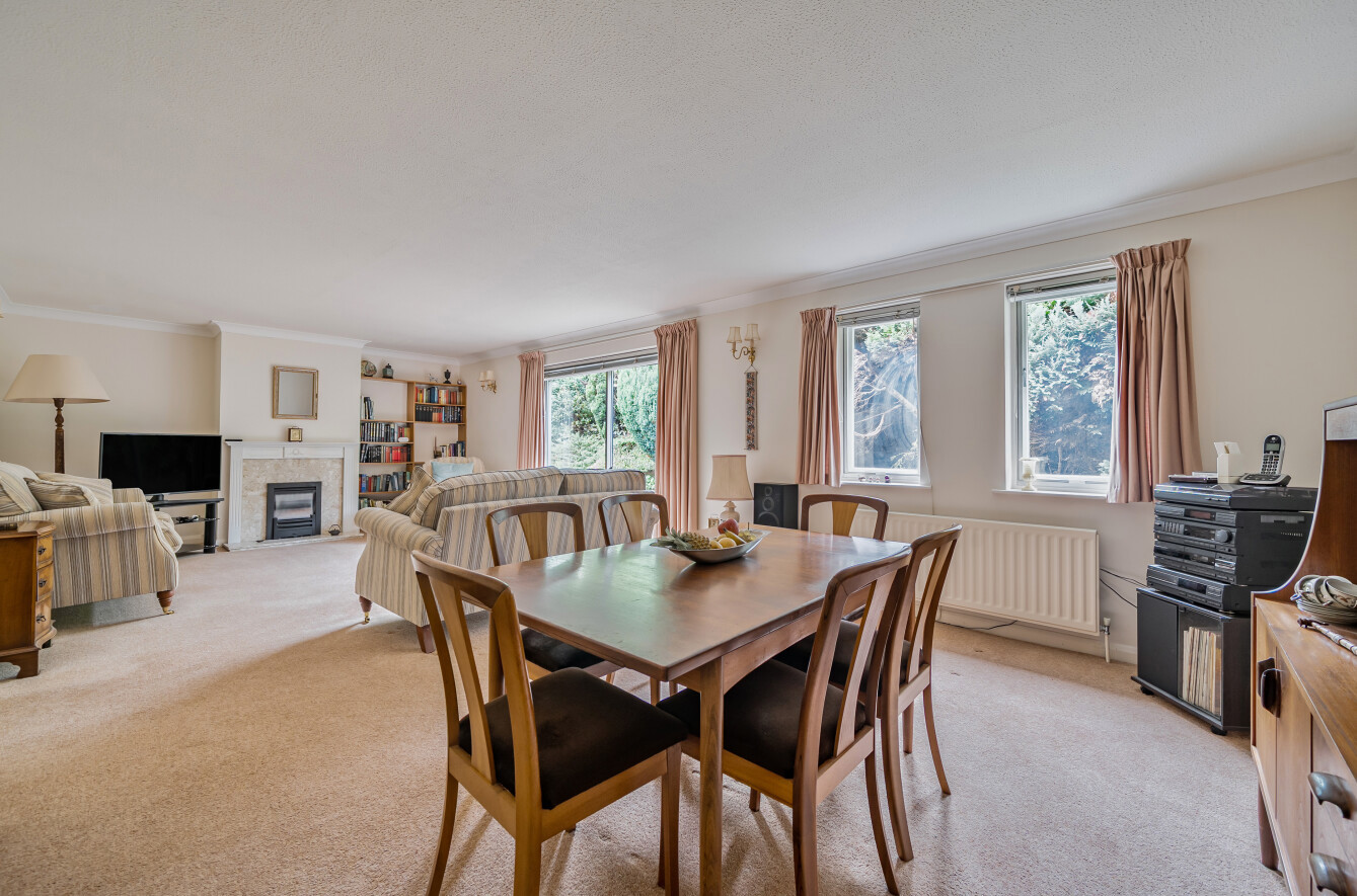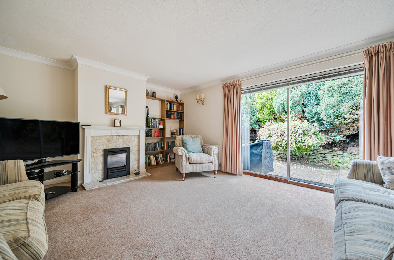 The living room is straight ahead, and is a generous 26'10 in width with plenty of space for dining and lounge areas, a fireplace with remote control gas fire and sliding patio doors which open onto a paved patio area flanked by mature bordered hedges.