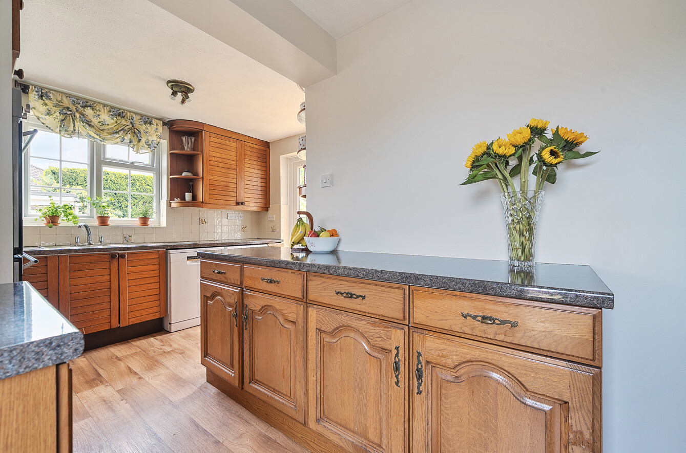 L-shaped kitchen with patio doors onto the garden. Fitted with a range of drawer and cupboard storage with integral oven and gas hob, with space for further white goods. Scope to extend (STPP) to create a superb state of the art kitchen ideal for modern day family lifestyles