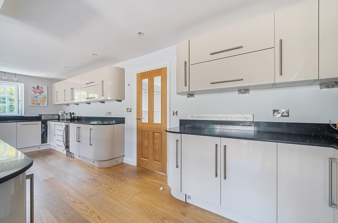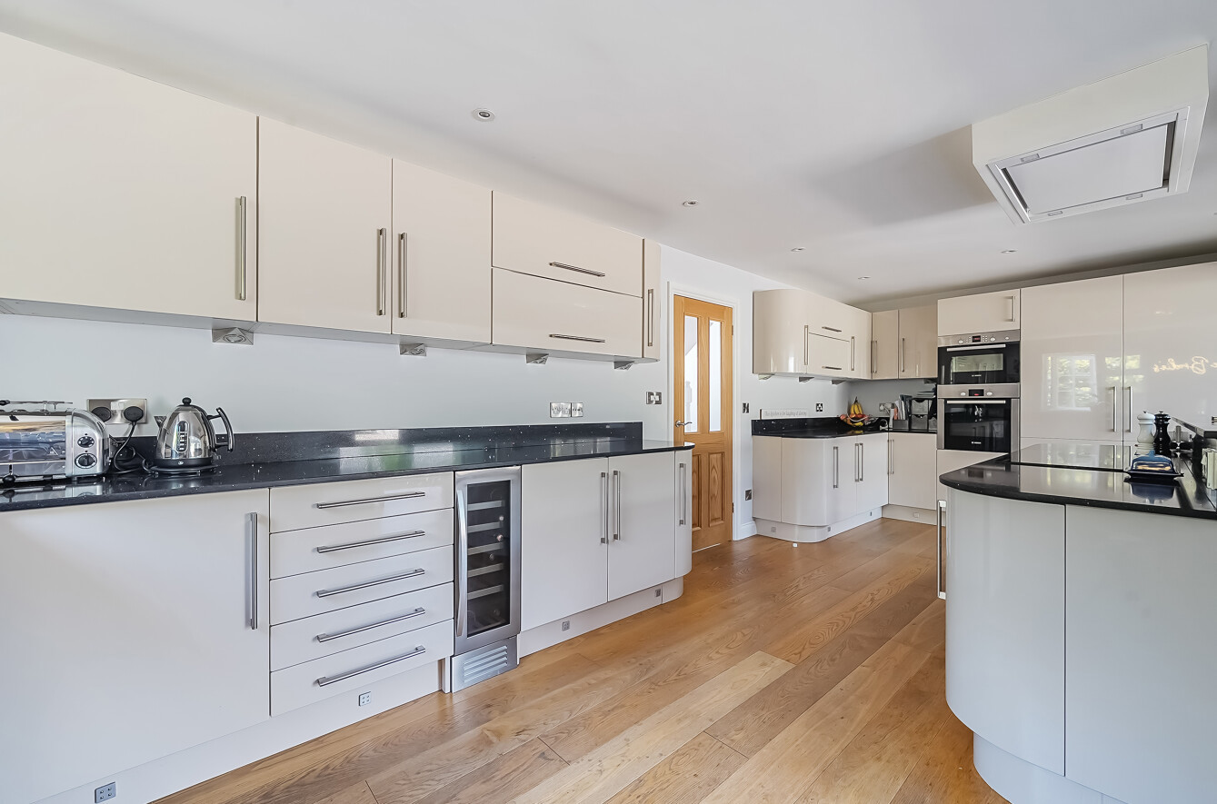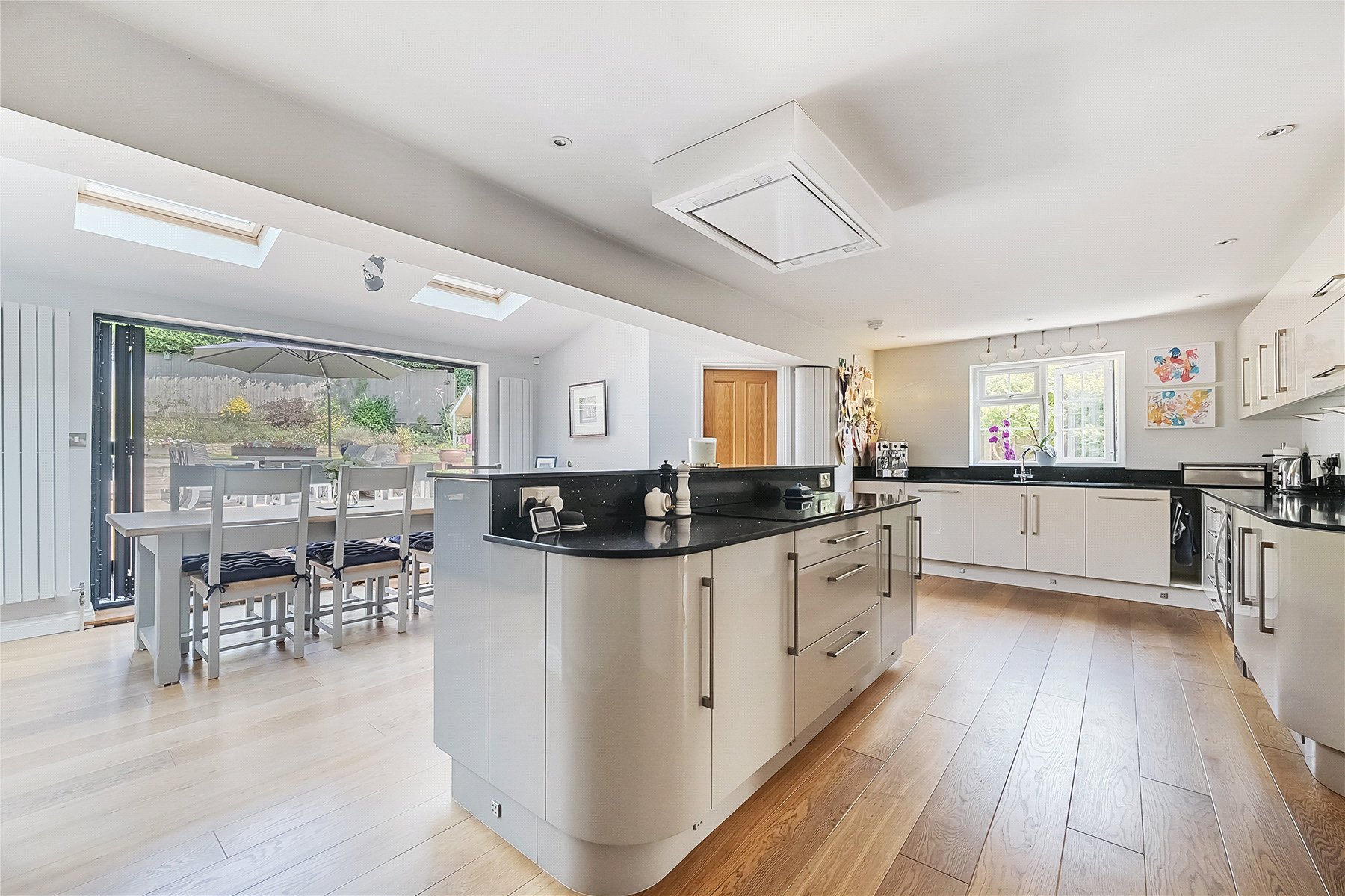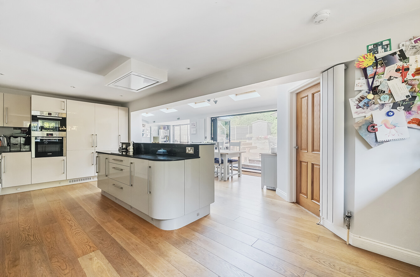 Internal bi-folding doors lead to the extension with high vaulted ceiling and 4 velux windows which allow light to stream through. A real wow moment comes when you step up to the kitchen island with views out to the garden. The modern kitchen with black quartz worktops provides a range of low and high-level storage units. The high-quality appliances include a Bosch electric hob, ceiling extractor fan, wine fridge, integrated individual full height fridge and freezer, dishwasher, double oven and a 1 and a half bowl sink.
