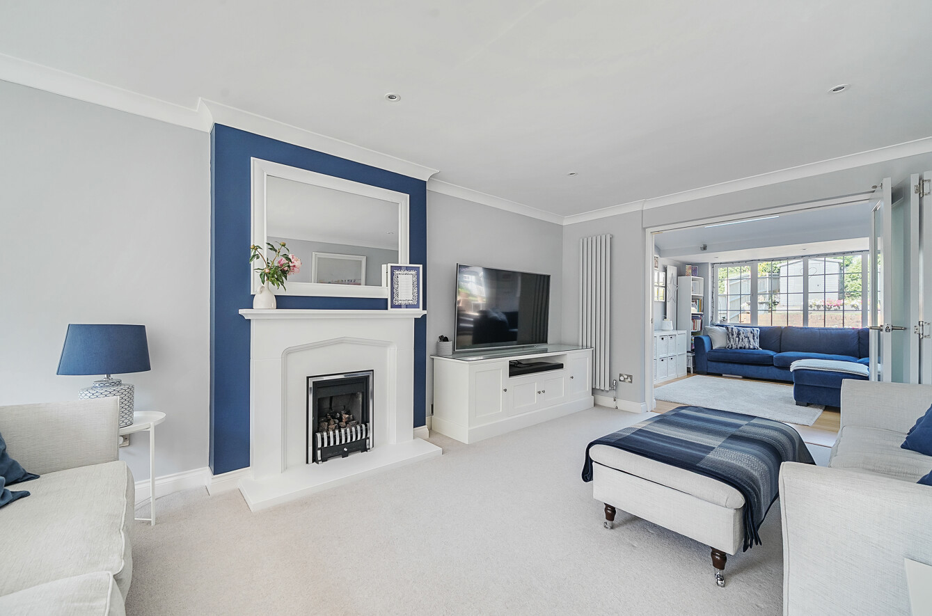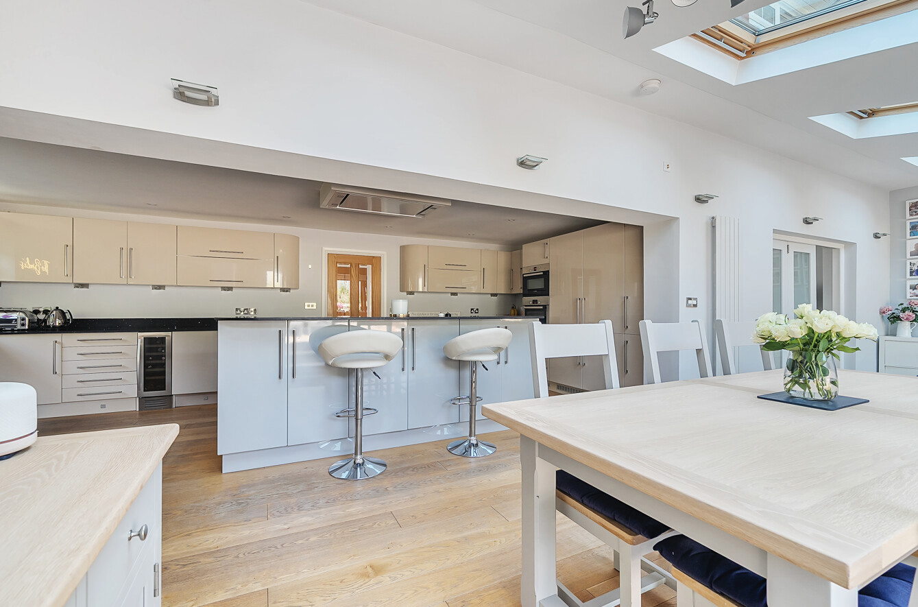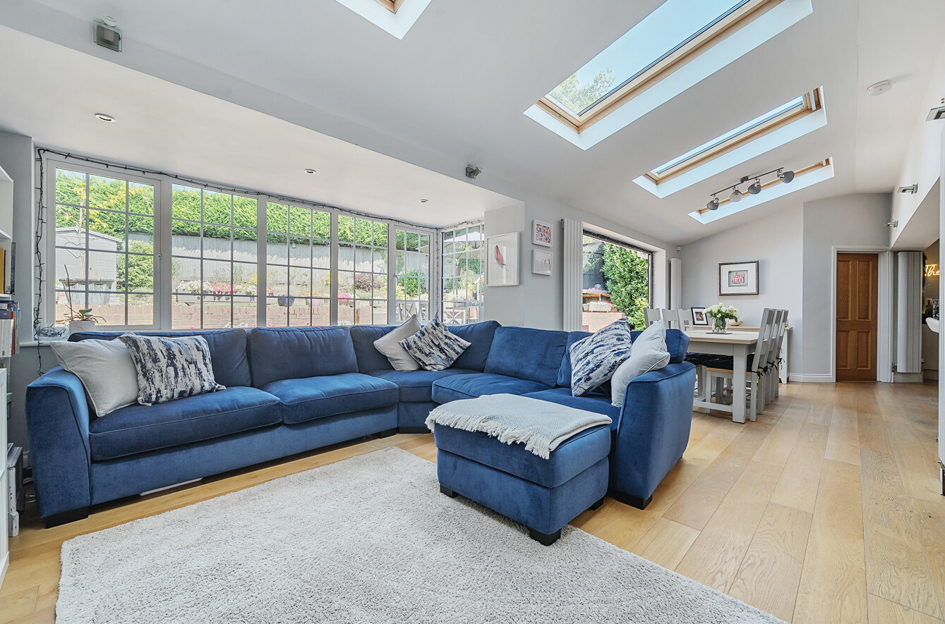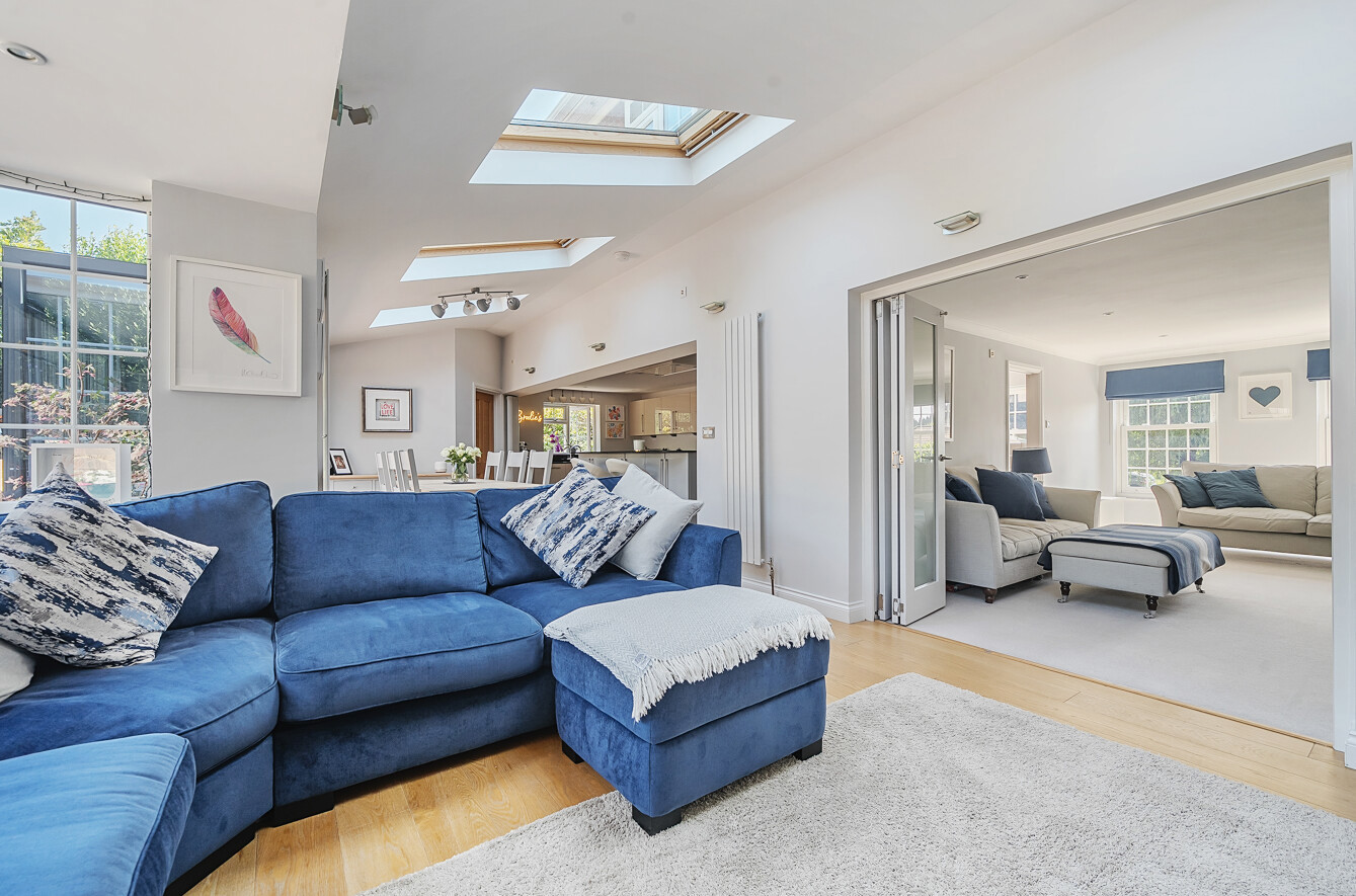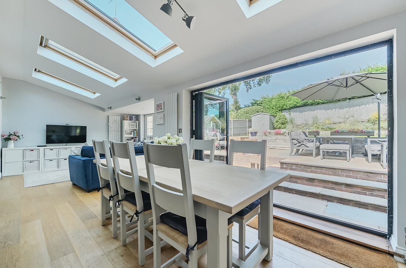Beyond the kitchen is a wonderful dining area with bi-fold doors opening onto the patio; perfect for socialising or using as a hub of the house. To the left of the extension is a casual sitting area for relaxing.