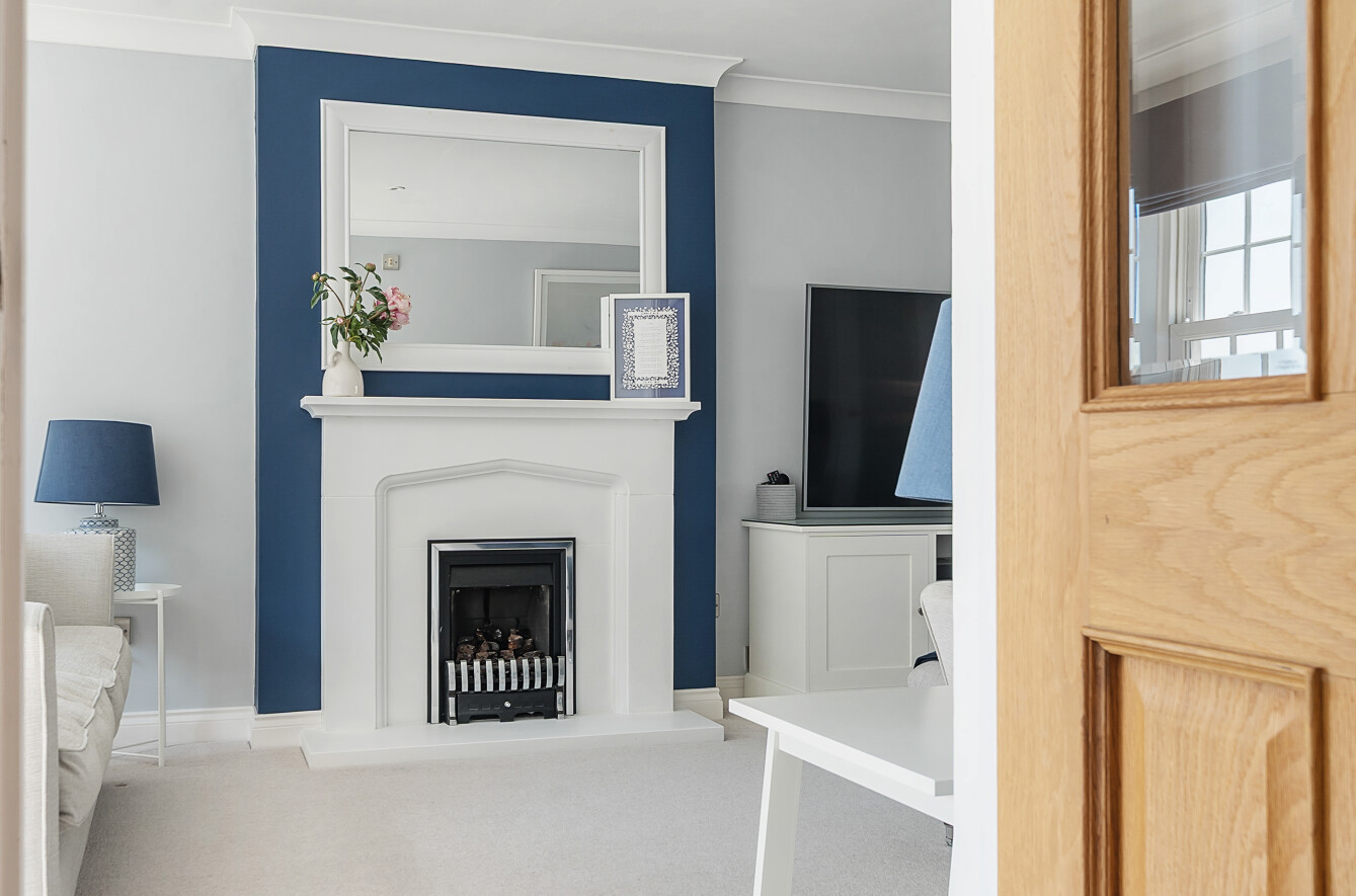 The carpeted living room is beautifully decorated with white feature fireplace with gas fire.