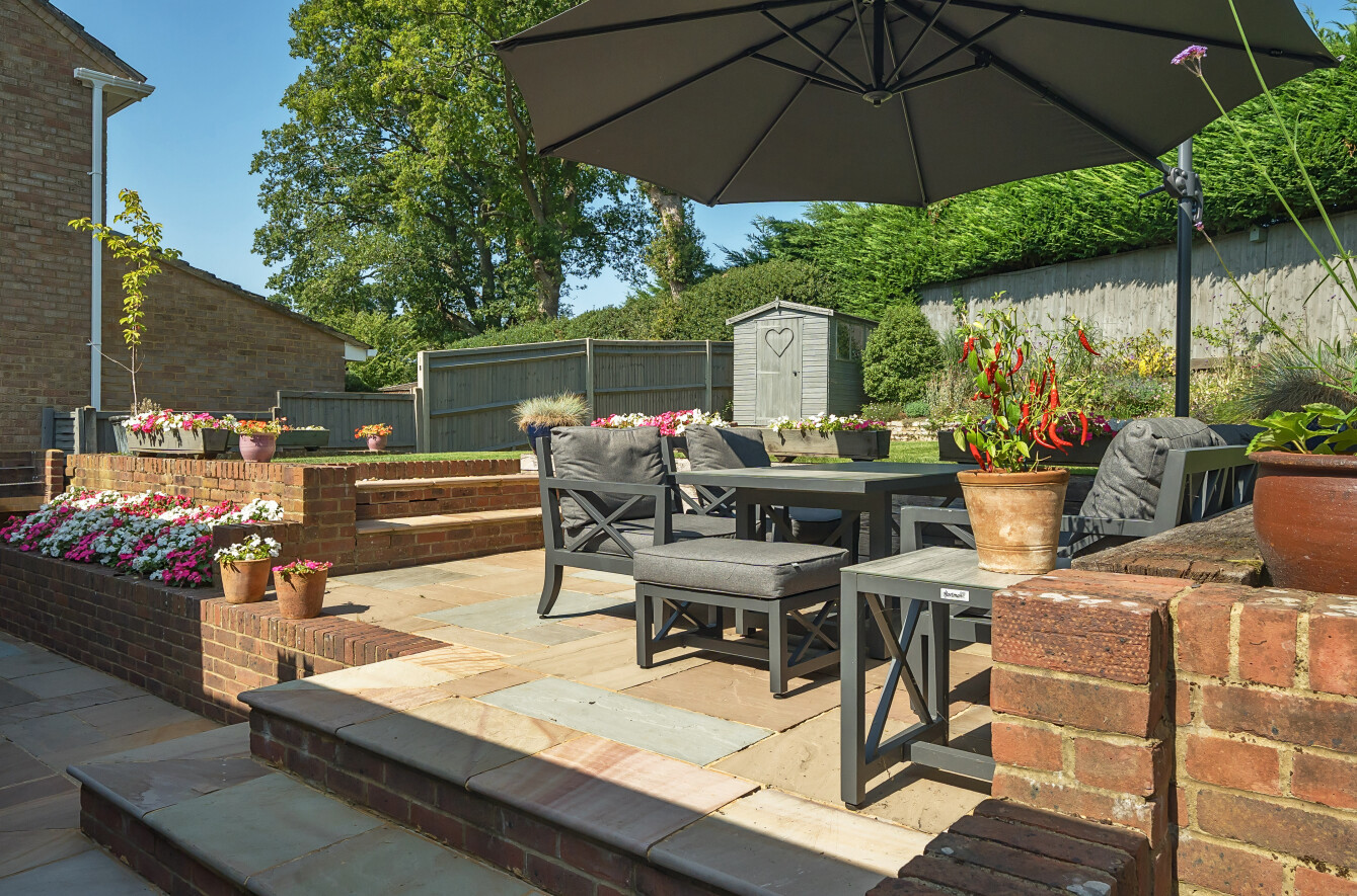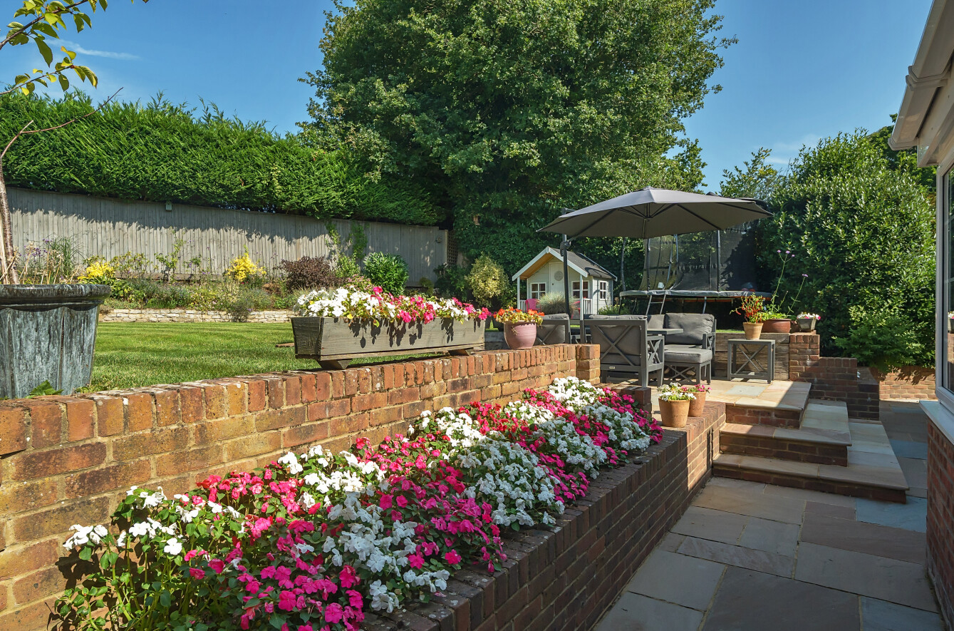 A side gate allows access to the beautifully landscaped private garden; a fantastic environment for children to play and adults to relax. Patio steps with brick surround lead up to a level dining area.