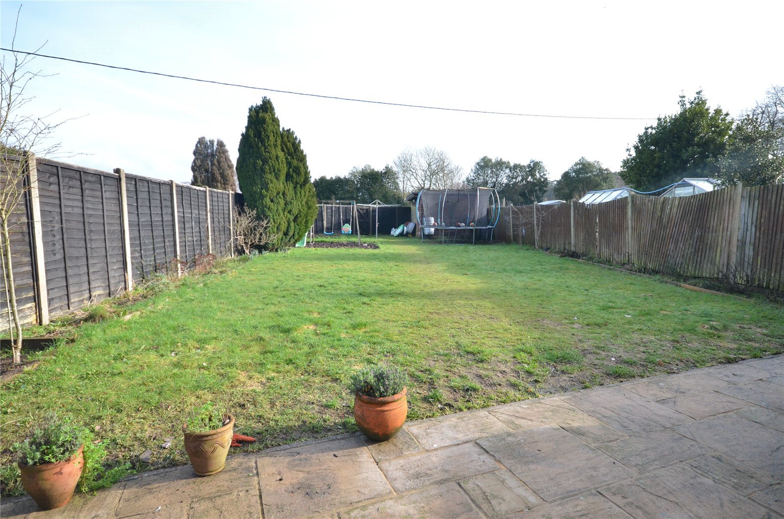 To the rear Attractive paved patio/sun terrace ideal for entertaining and al fresco dining, to large area of lawn, mature borders, enclosed by fencing and gated access onto a playing field. Large timber shed, power and light.