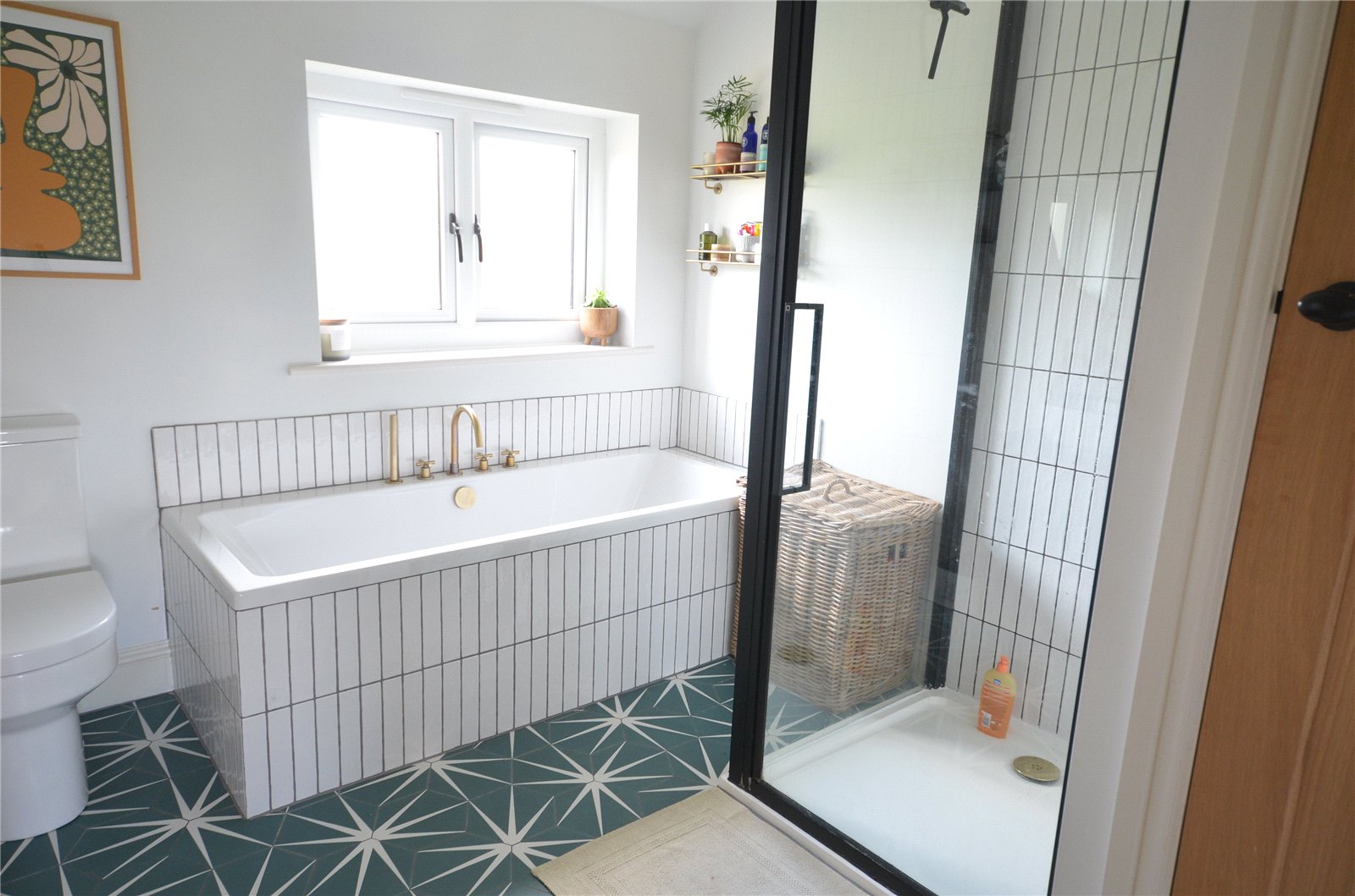 Modern bathroom In classic white, frosted window, tile enclosed bath with pull out shower, separate shower cubicle with glass screen, w.c., vanity wash hand basin with cupboard under, linen cupboard, heated towel rail.