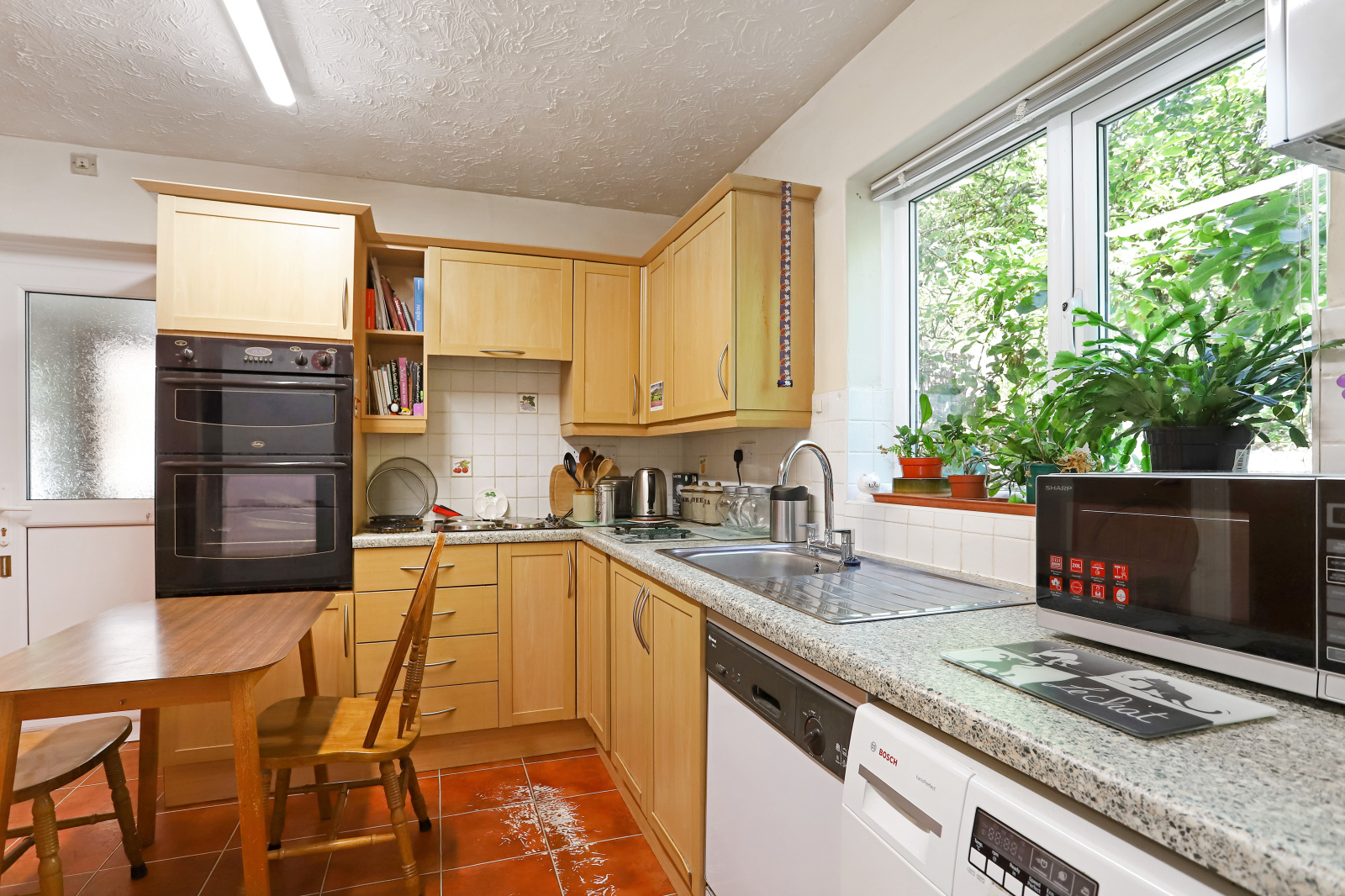 Kitchen Side aspect, range of eye and base level units, sink unit, plumbing for washing machine and dishwasher, electric double oven and electric hob, Vaillant gas fired boiler, worktops, airing cupboard housing hot water tank, cupboard to side, two built-in larder/store cupboards, door to rear porch.