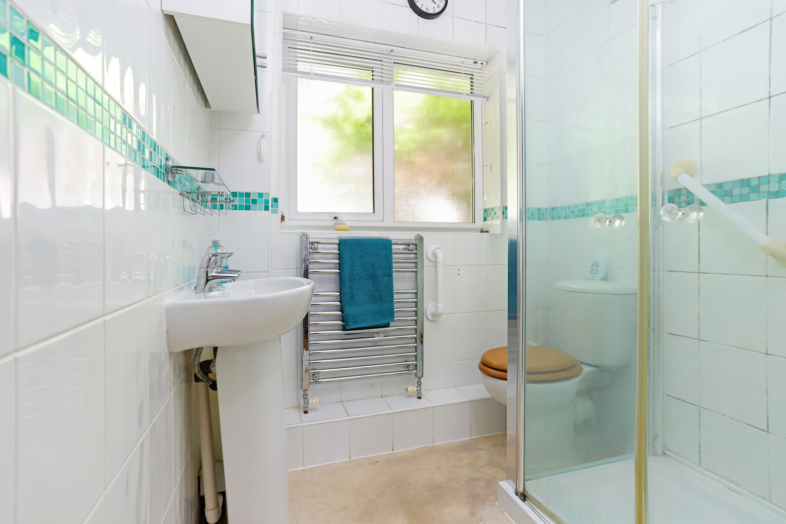 Shower Room Frosted window, shower cubicle, w.c., pedestal wash hand bason, heated towel rail.