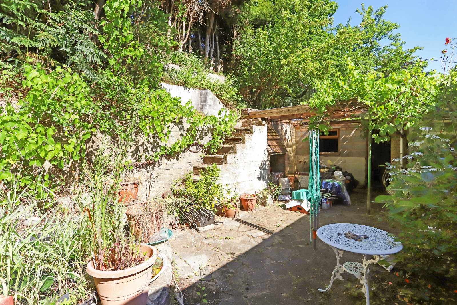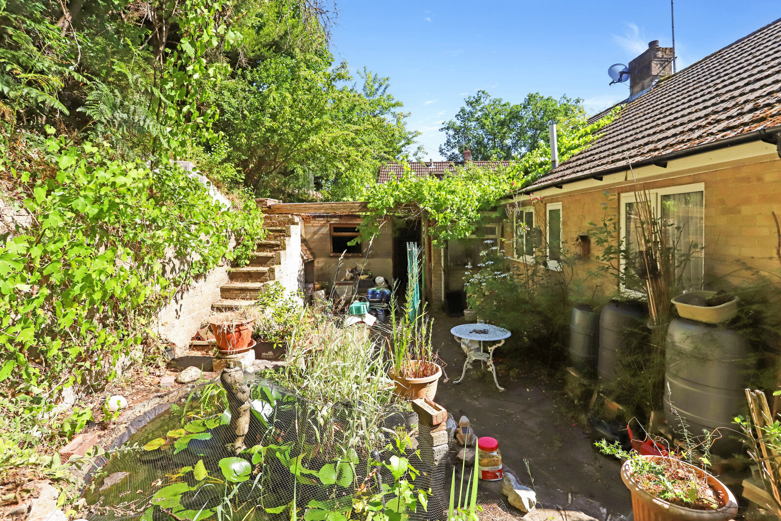 Rear Garden Paved courtyard garden, ornate garden pond, brick barbecue, step to raised borders. Outbuilding/store.