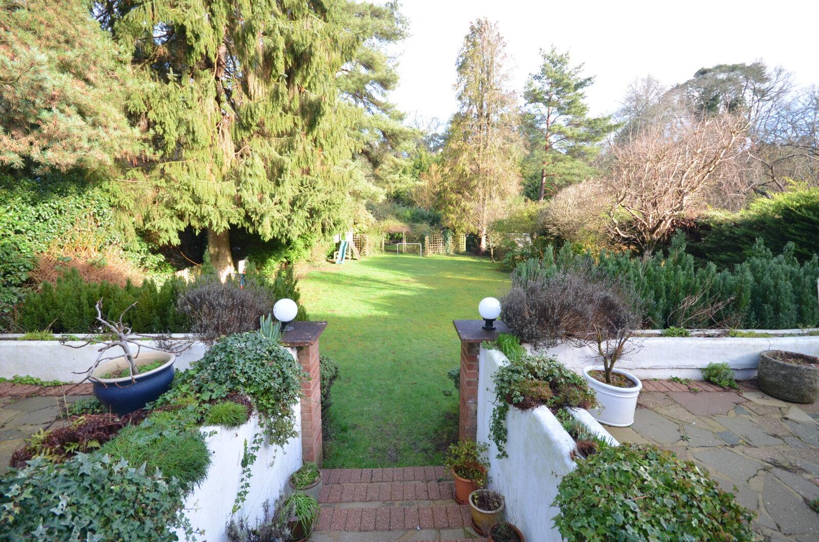 Impressive first floor Sun Terrace Generous in size with tap, outside lighting and enjoying wonderful views over the secluded rear garden and light woodland beyond.