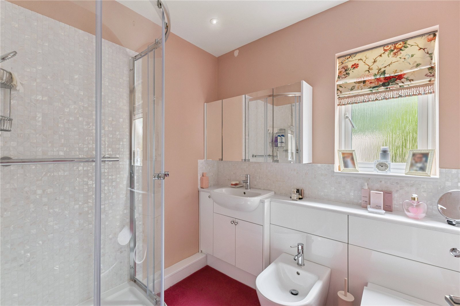 Shower Room Frosted window, modern Duravit suite in classic white, fully tiled shower cubicle, WC, bidet, vanity wash hand basin with cupboards under, heated towel rail.