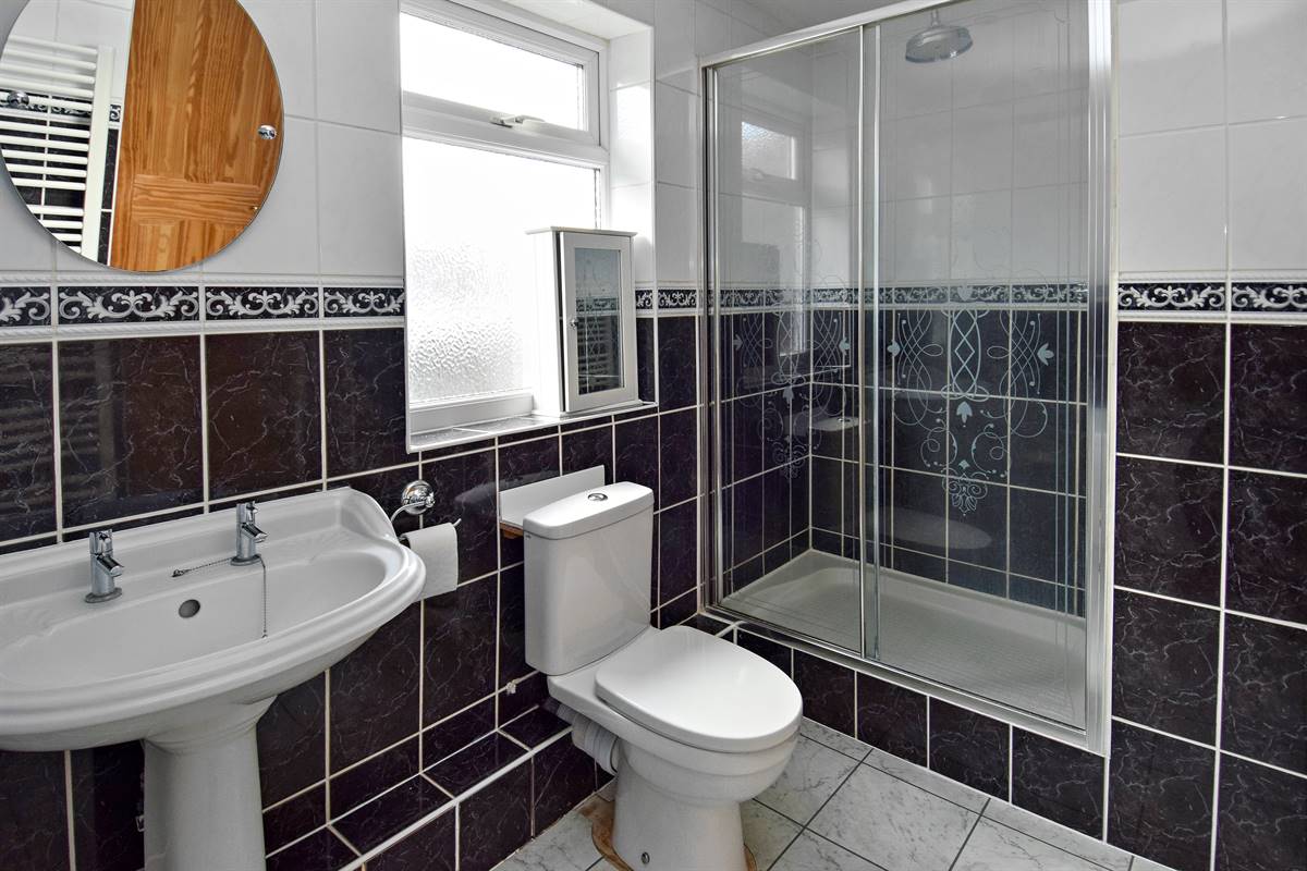 Suite in white comprising panelled bath with mixer tap and hand held shower attachment, separate fully tiled cubicle, pedestal wash hand basin and close coupled WC. Heated towel rail. Tiled walls. Frosted window to rear. Laminate flooring. Extractor fan.