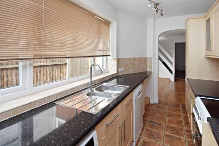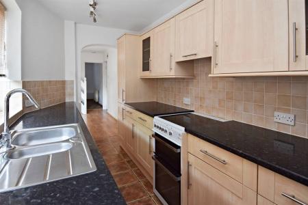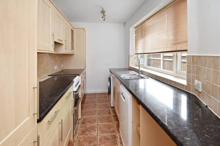 The kitchen is planned with a matching range of wall and base units arranged on two walls. Inset stainless steel 1½ bowl sink unit. Partially tiled walls. Electric cooker point. Extractor cooker hood above. Plumbing for washing machine and dishwasher. Window to rear. Tiled flooring.