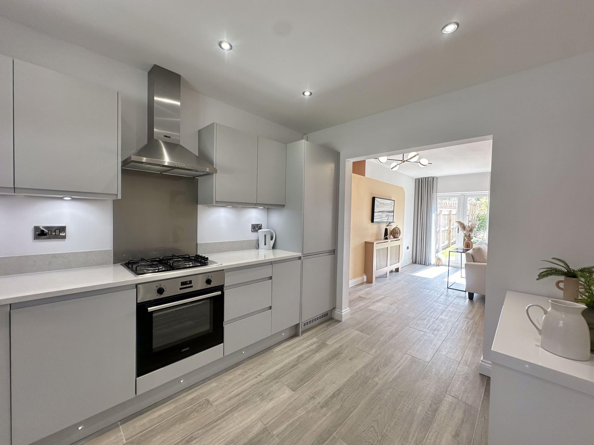 - Open plan lounge, kitchen, dining area with French doors to the garden