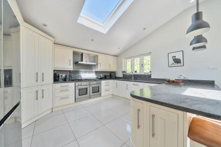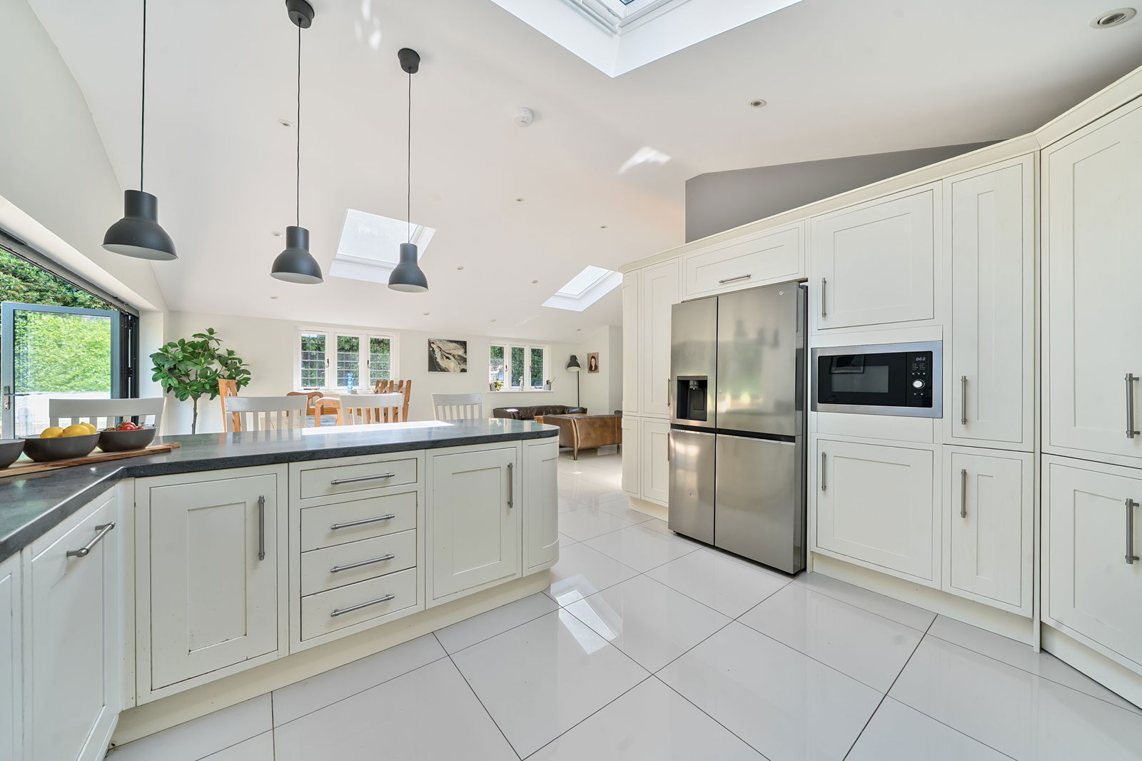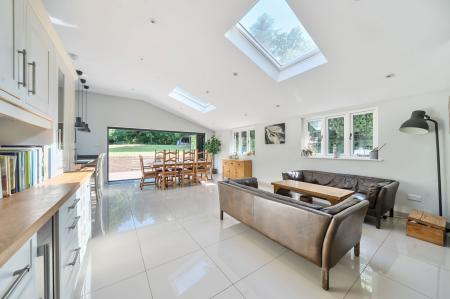 Tucked away at the end of a quiet private road between Newchapel and Felbridge, this exceptional family home offers seclusion, space, and style in equal measure. Spanning over 2,100 sq ft, the property has been thoughtfully extended and updated to create a truly impressive living environment. At the heart of the home is a stunning open-plan kitchen, dining, and living space, a beautifully bright and sociable area with vaulted ceilings, skylights, and sleek finishes. Perfect for entertaining or family life, this expansive room flows seamlessly into the rest of the ground floor, and with bi-fold doors leading out onto the beautiful patio, making the most of the private gardens.