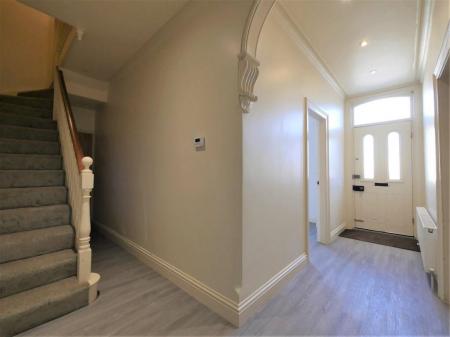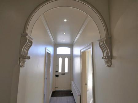 ENTRANCE HALL Radiator, bookend archway, stripped traditional style wooden panelled doors to sitting rom, dining room, cloakroom and basement, stairs with spindle railed banister rising to first floor, wood effect flooring, inset ceiling lights.