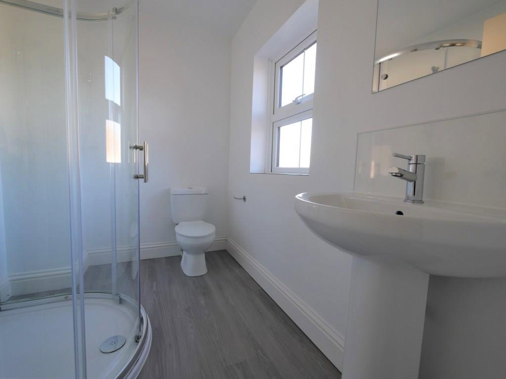 EN-SUITE Obscured double glazed window to front, chrome heated towel rail, shower cubicle with thermostatic shower, low level WC, pedestal hand-wash basin with mixer tap, wood effect flooring, inset ceiling lights, extractor fan.