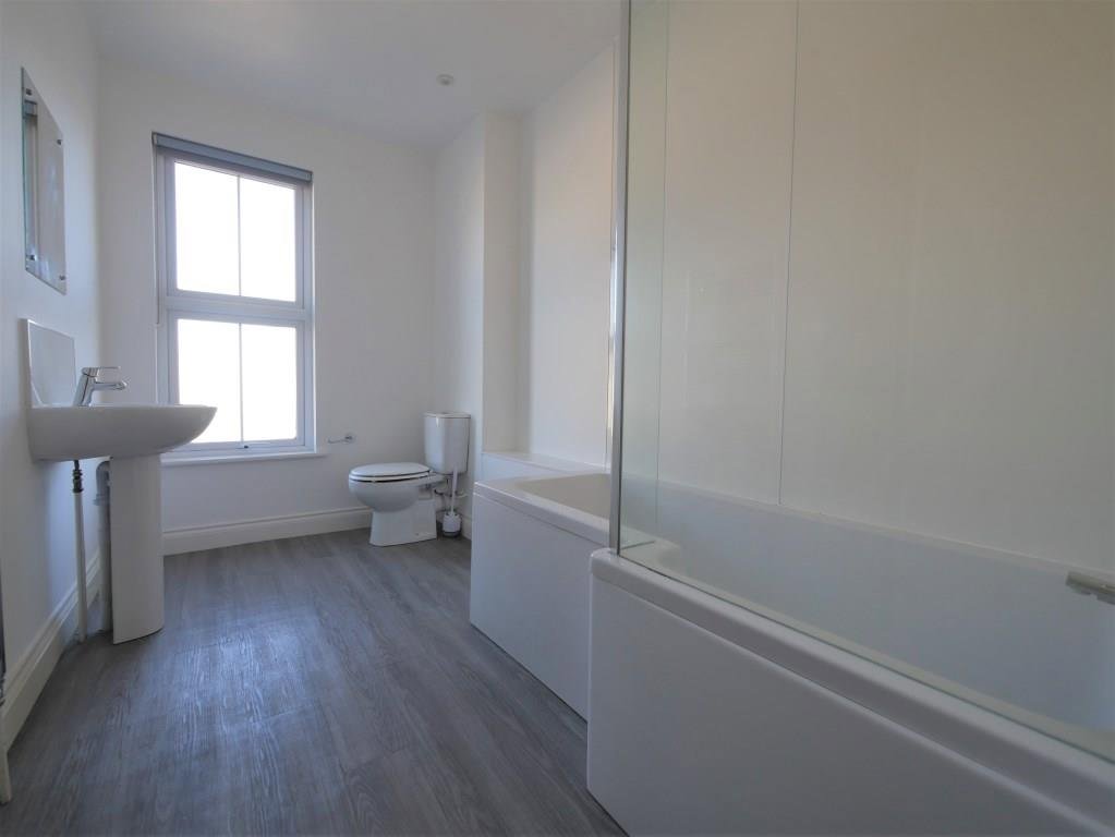 FAMILY BATHROOM Obscured double glazed window to front, chrome heated towel rail, shaped shower bath with thermostatic shower, mixer tap and side screen, low level WC, pedestal hand-wash basin with mixer tap, wood effect flooring, inset ceiling lights, extractor fan.