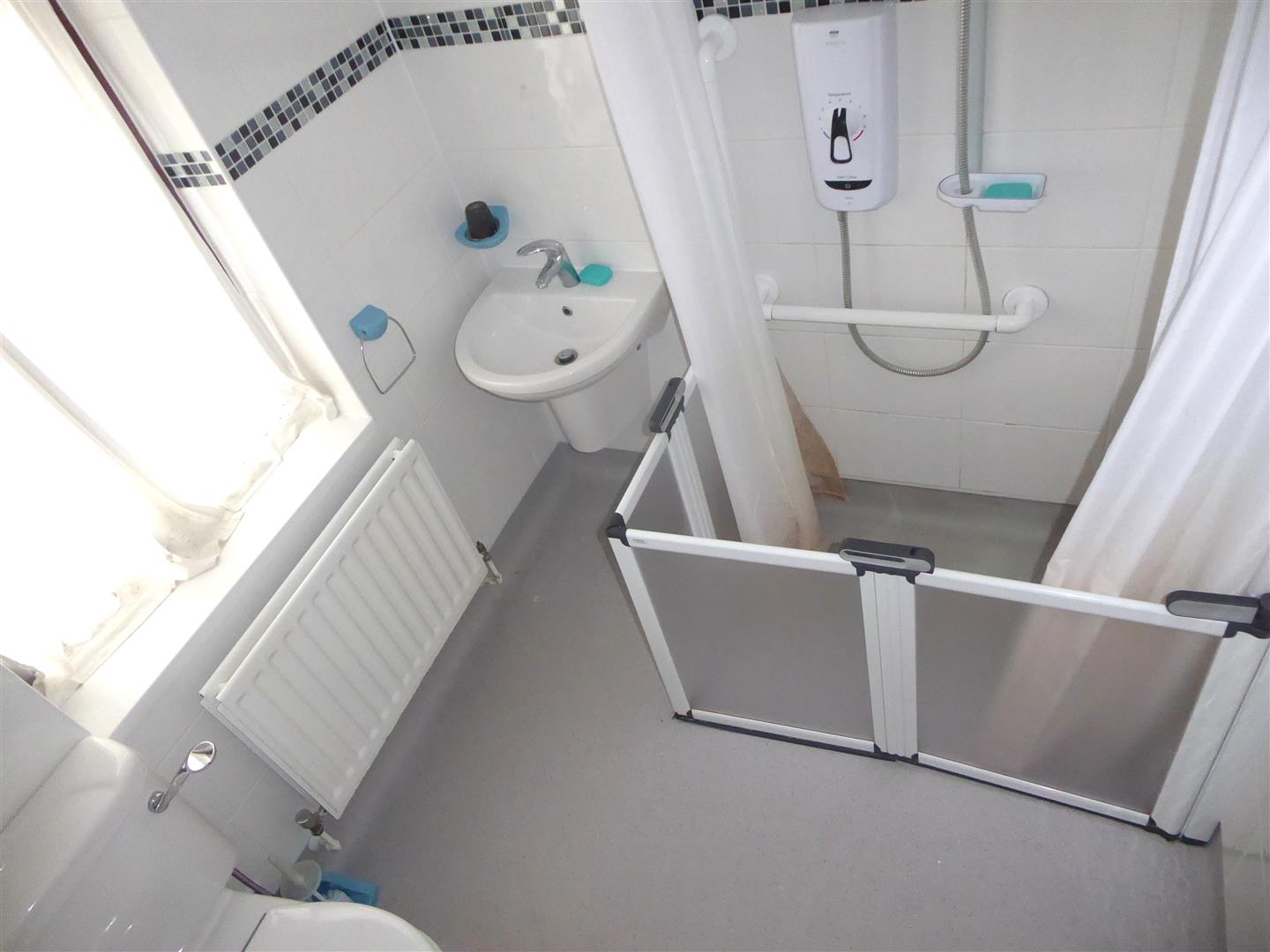 Shower/Wet Room - Wall mounted shower unit, wash hand basin, low level w/c, tiled flooring, radiator, rear aspect double glazed window.
