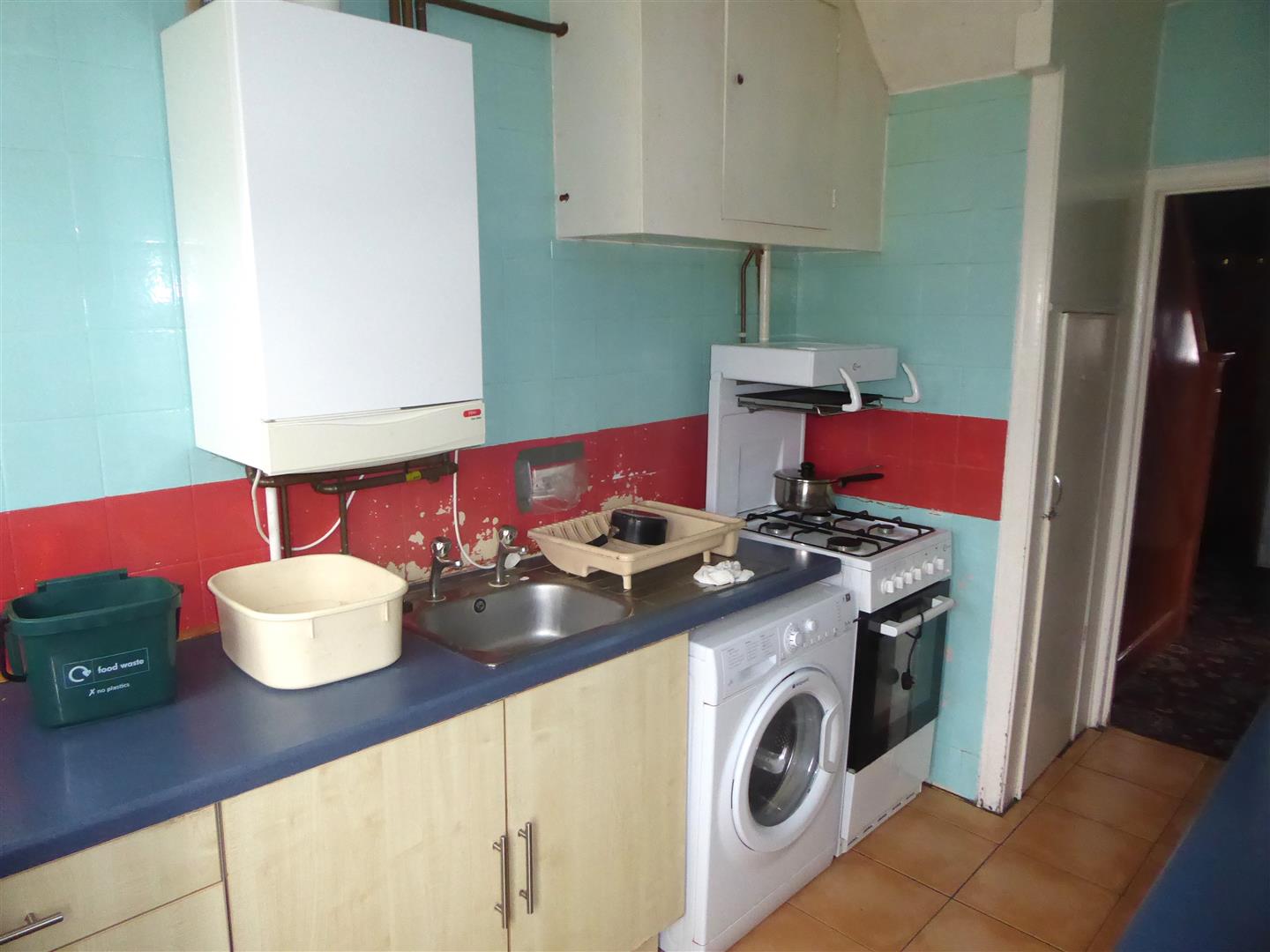 Kitchen - Single drainer stainless steel sink unit with cupboard below, further floor mounted units, space for cooker, fridge and washing machine, wall mounted boiler, radiator, tiled walls and flooring rear aspect double glazed window, understairs cupboard housing meters.