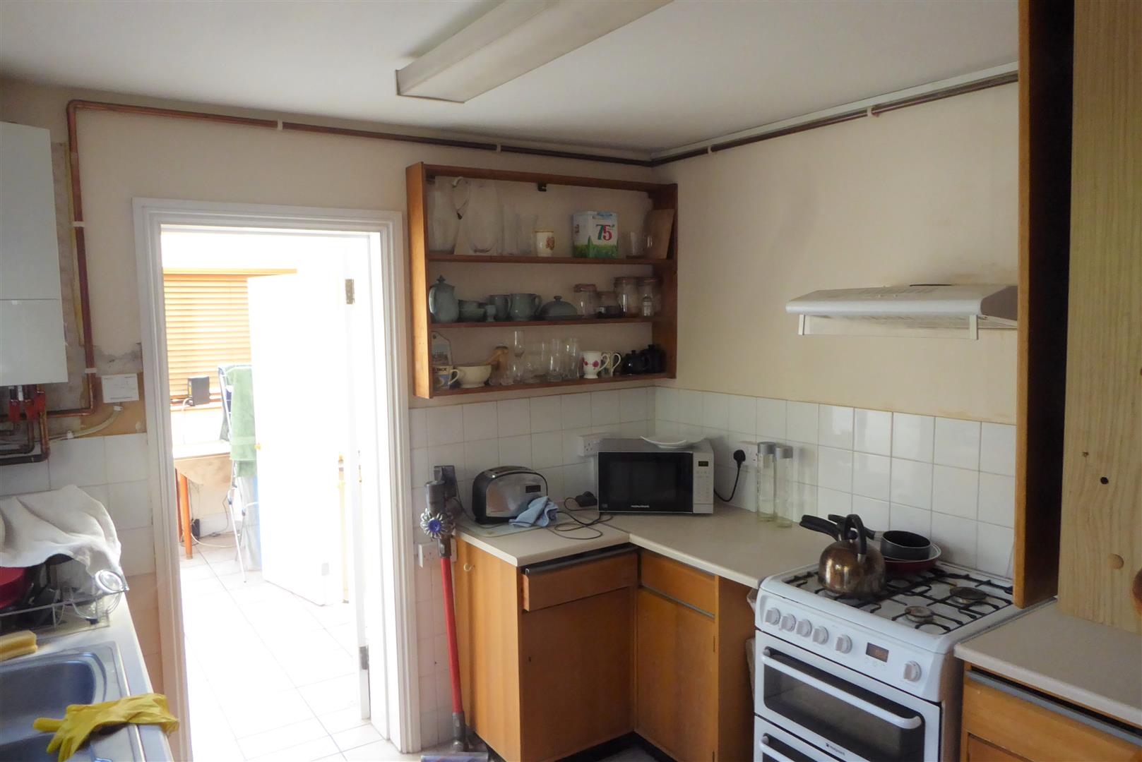 Kitchen - Range of unit, double bowl sink with mixer tap, cooker point, wall mounted combination boiler, side aspect window and door to garden.