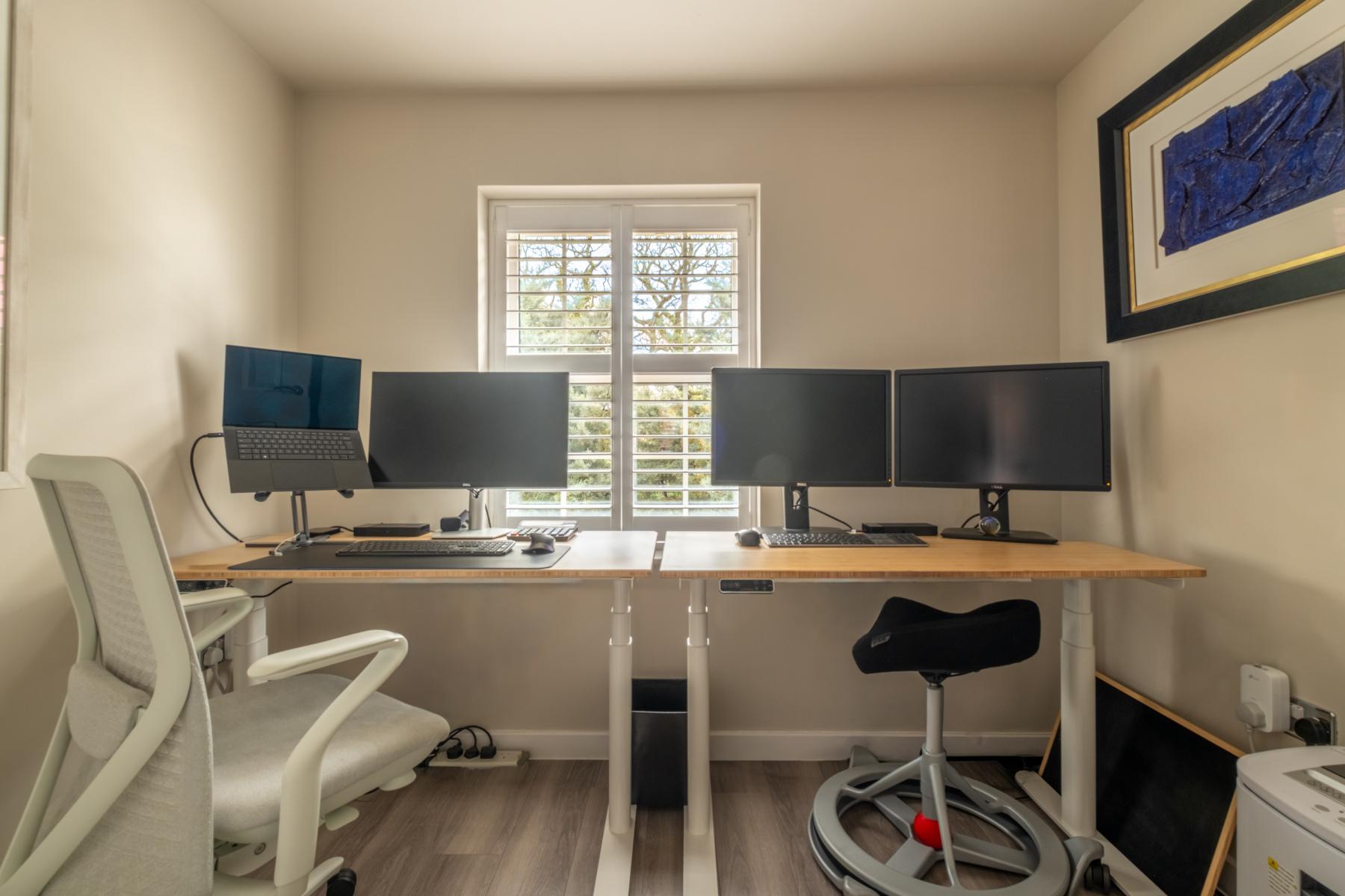 The FOURTH BEDROOM is a well-proportioned single, currently arranged as a home office, comfortably accommodating two desks and computer setups, making it ideal for remote working or study.