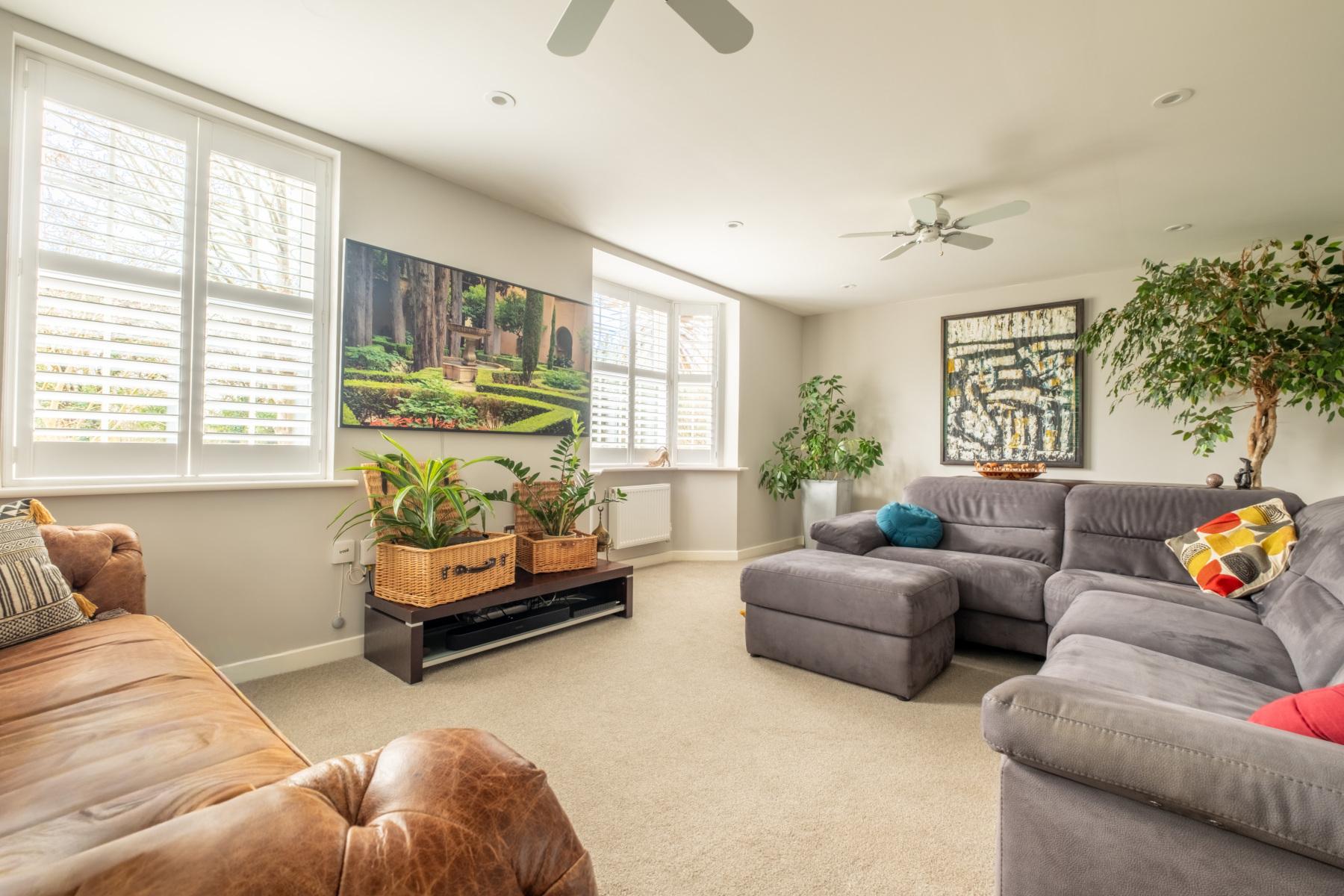 The SITTING ROOM is light, spacious and versatile, featuring a bay window with two further windows, all fitted with white louvered shutters. Two ceiling fans enhance comfort, and a TV point is positioned for wall-mounted media. The room comfortably accommodates a range of seating arrangements, including two sofas or an L-shaped layout.