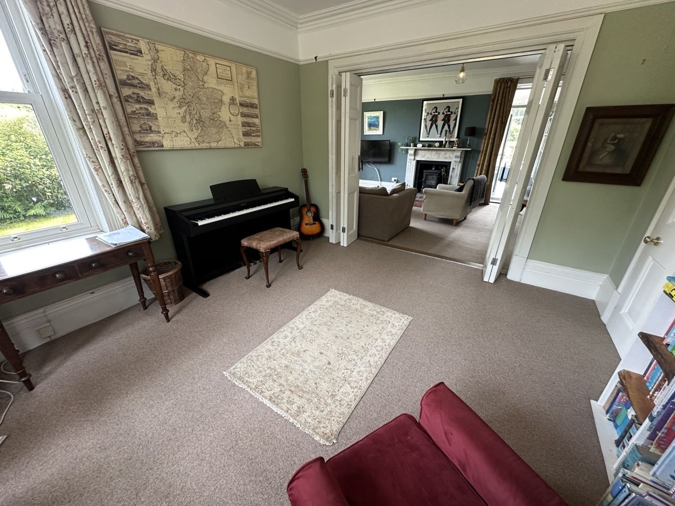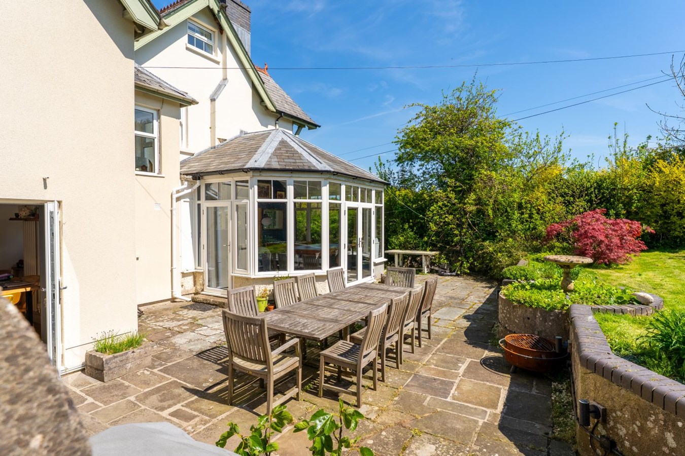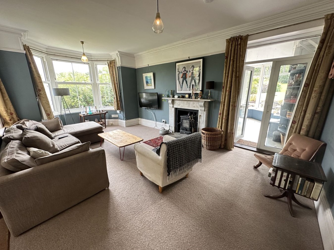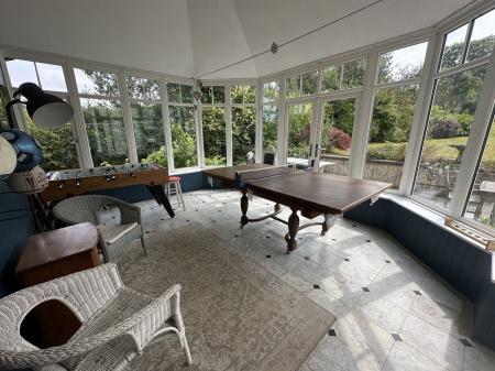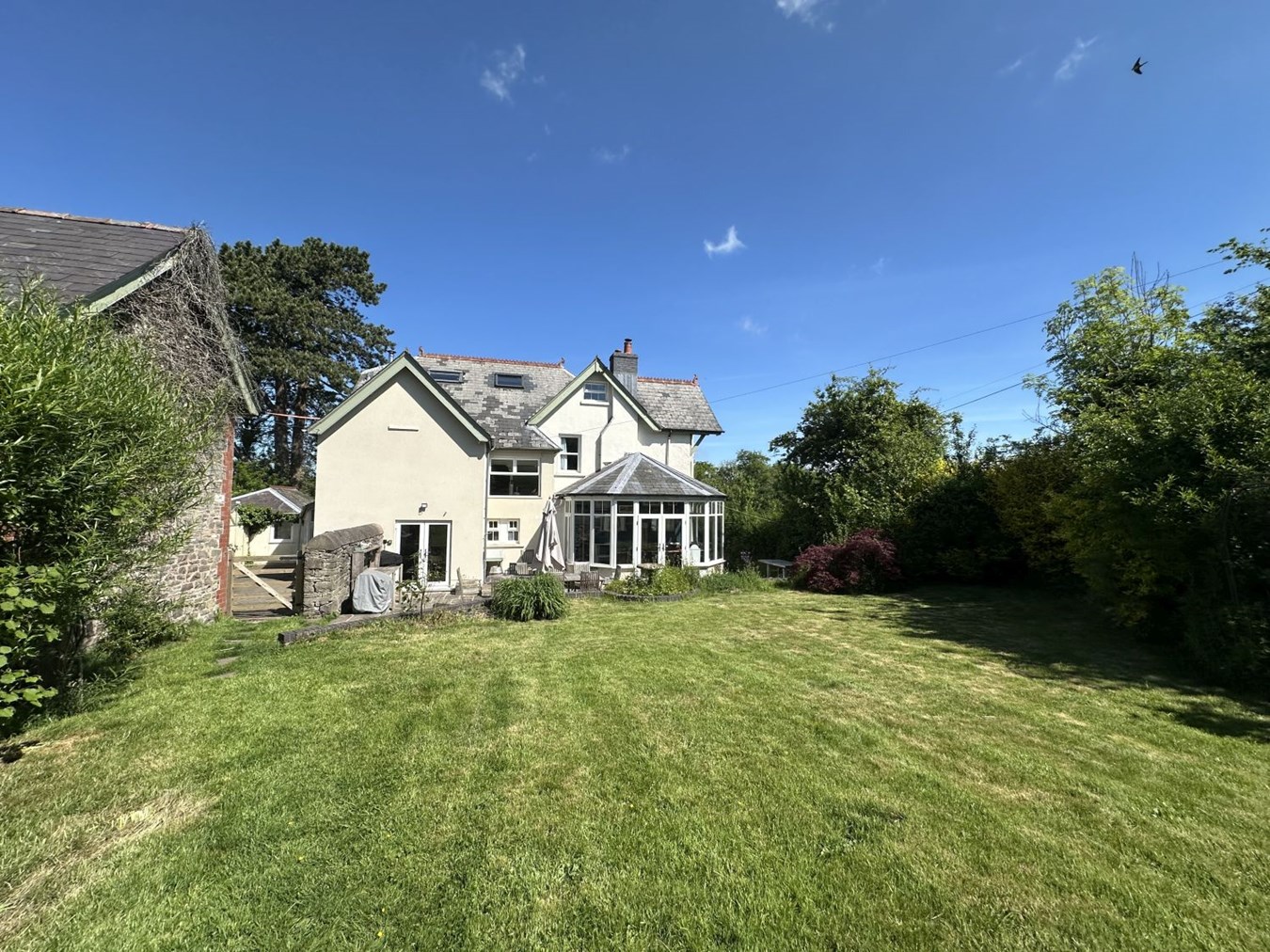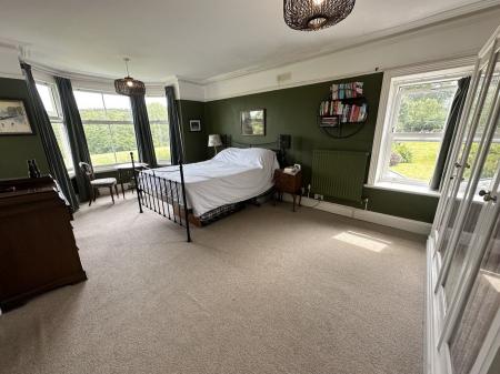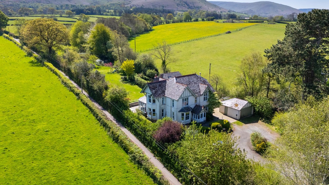 Danyfan is an impressive Edwardian home with a detached two-bedroom annexe, double garage, generous gardens, a glamping railway carriage and a paddock; offering a rare combination of character, space and versatility. The main house is a spacious family home that retains a wealth of original features, including coloured and leaded glass, a patterned tiled hallway floor, decorative coving, picture and dado rails, bay windows, period fireplaces, wood-burning stoves, panelled doors, and an elegant staircase. On the ground floor, the entrance porch and hallway lead to two interconnecting sitting rooms, divided by folding doors, ideal for opening up the space for larger gatherings and entertaining. The kitchen/dining/sitting room is a practical and welcoming space with wooden flooring, base cupboards, wooden worktops, a breakfast bar, range cooker, ceramic sink and plumbing for a dishwasher. An archway leads into a bright and airy breakfast room with patio doors opening onto the garden. There is also a useful cloakroom and a conservatory that enjoys garden views. Upstairs, the first floor has a spacious landing, four bedrooms (two with en-suites), and a well-appointed family bathroom. Two of the bathrooms feature attractive roll-top baths. On the second floor is a fifth bedroom and a bathroom/laundry room.