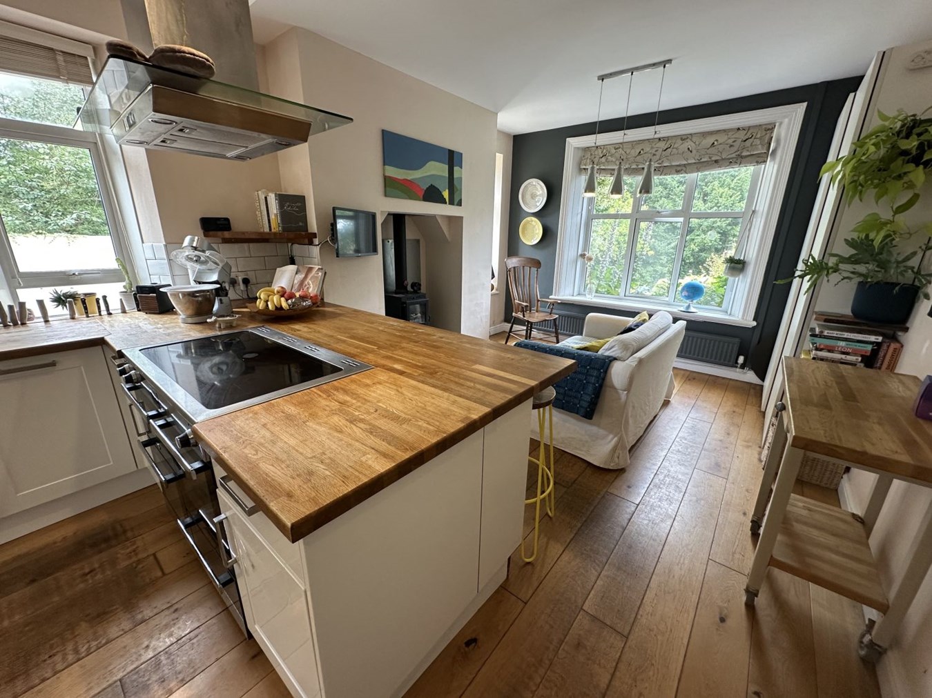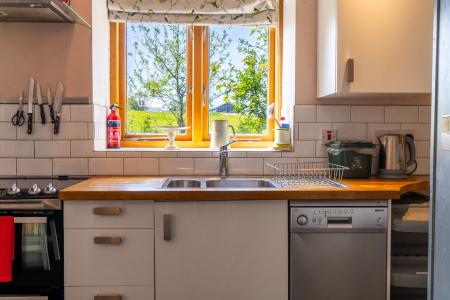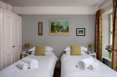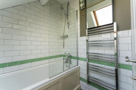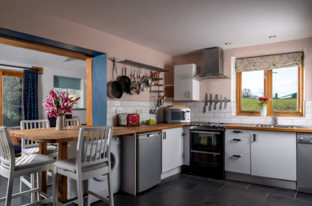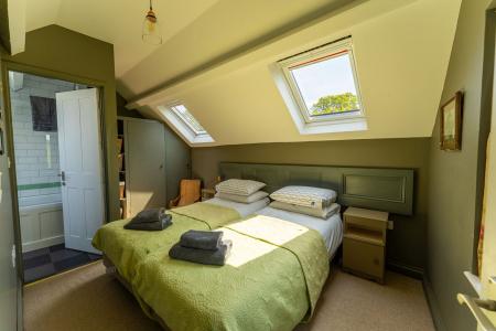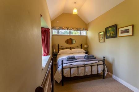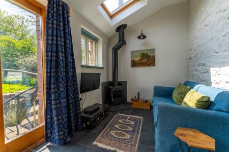 The annexe, a charming converted stable block, is ideal for holiday letting or as independent accommodation for a family member. Finished to a high standard, it offers light and well-designed spaces. The ground floor includes a living room with a wood-burning stove and French doors to the garden and an open-plan kitchen with slate flooring, underfloor heating, fitted cupboards, wooden worktops, a cooker and plumbing for both a dishwasher and washing machine. There is also a bedroom and a shower room on this level. Upstairs is the second bedroom with its own en-suite bathroom.