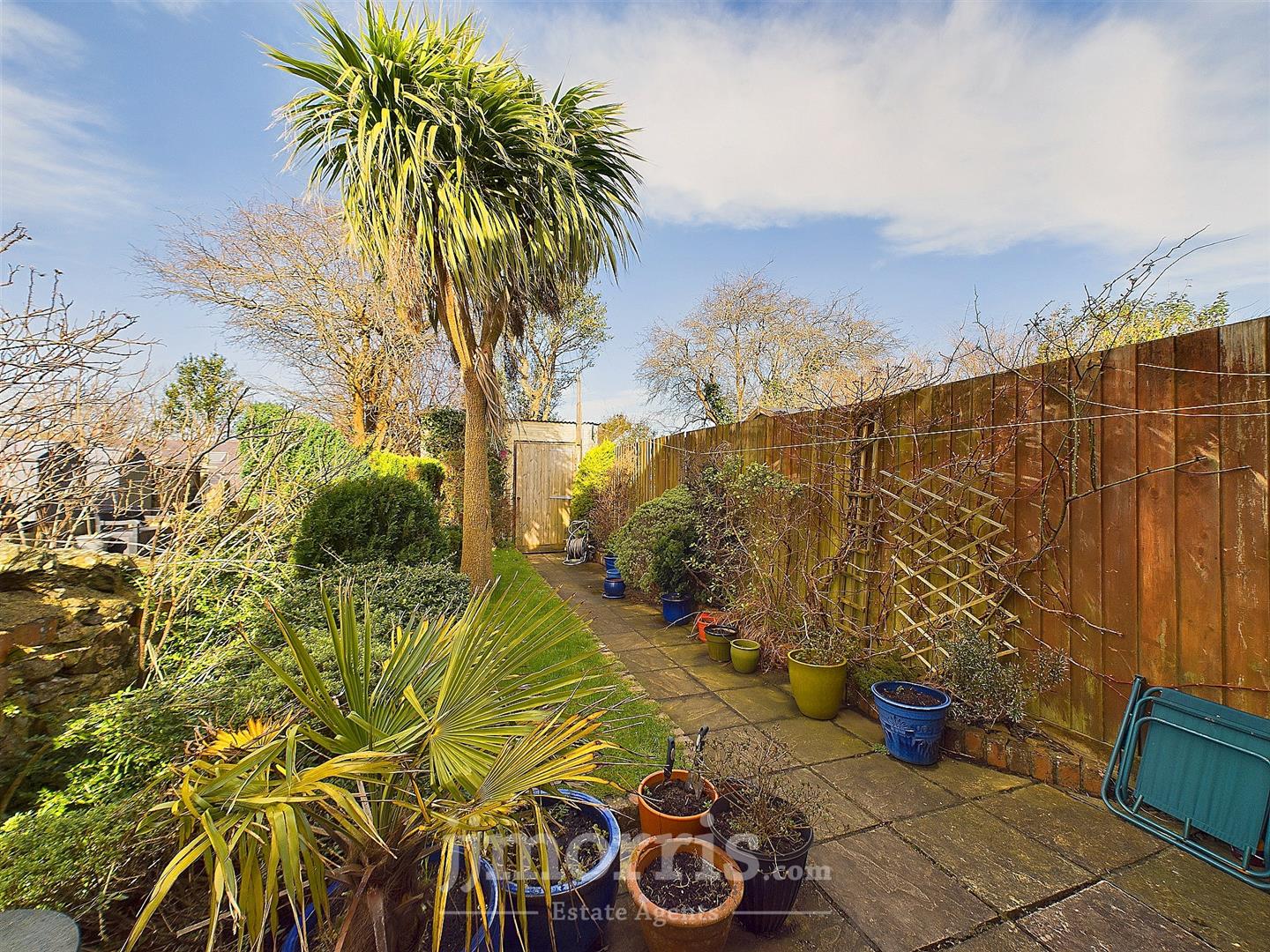 - Delightful Private Lawned Garden with Paved Patio, Flowering Shrubs and 2 Yucca/Palm Trees.