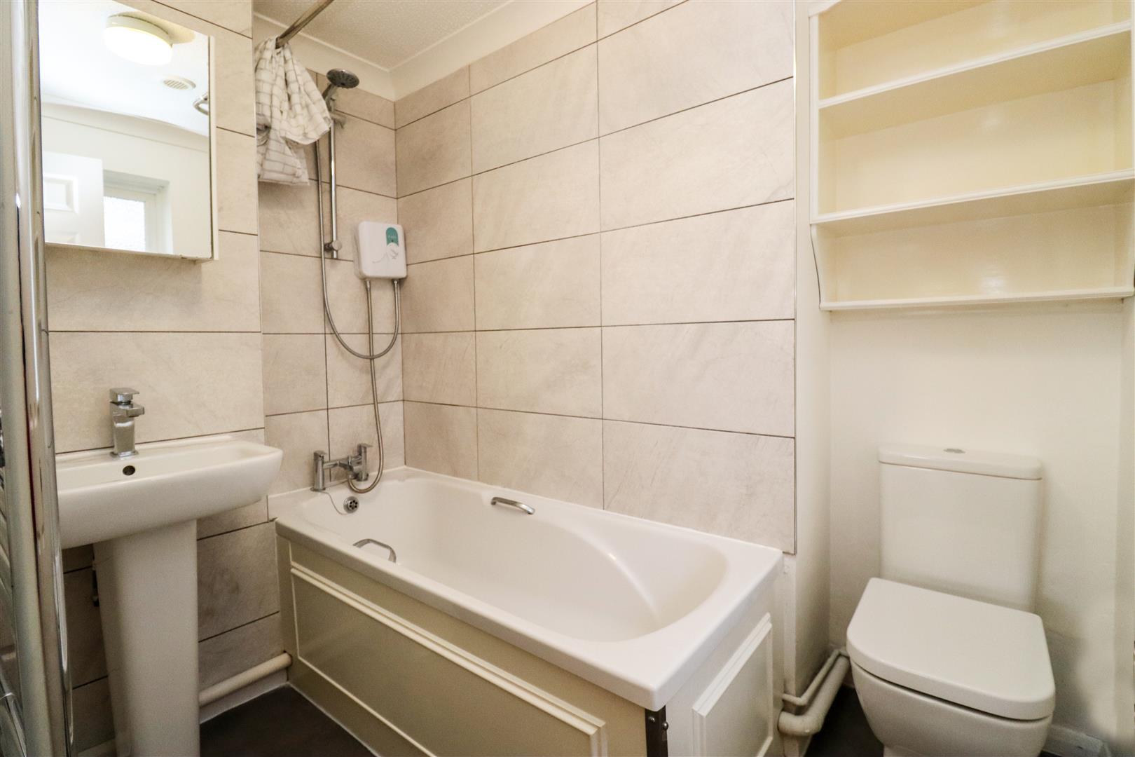 Door leading to the bedroom with double glazed window, wall mounted heater and built-in cupboard. The bathroom is accessed from the bedroom and comprises; panel enclosed bath with mixer tap and shower over, low level W.C. and pedestal hand wash basin.