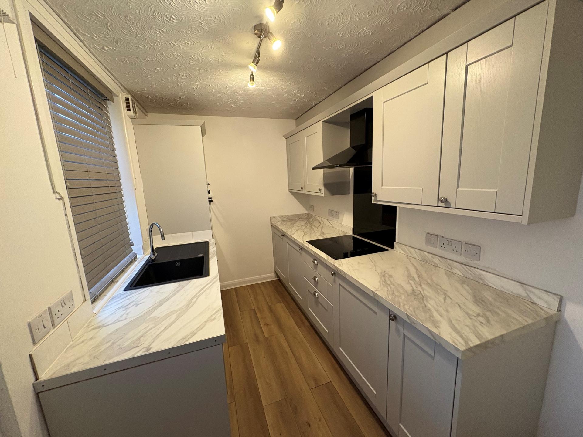 MODERN FITTED KITCHEN 11' 4" x 6' 8" (3.46m x 2.04m) Range of shaker style units comprising base cupboards and drawers, worktops with inset single drainer sink unit with mixer tap, eye level wall cupboards, multi speed cooker hood above the electric hob, electric oven, extractor fan, UPVC window, textured ceiling, ceiling spotlights, door to: