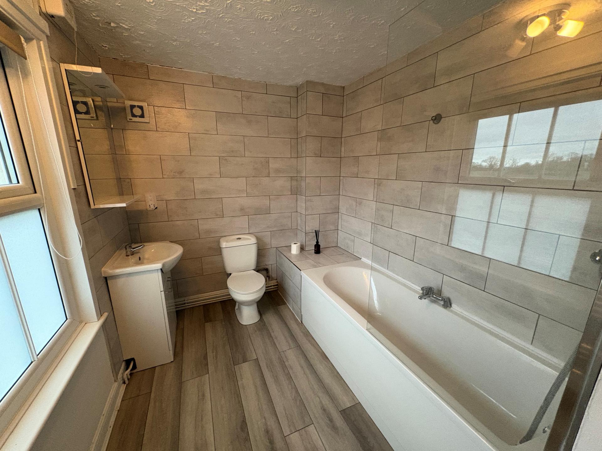 BATHROOM 11' 6" x 6' 9" (3.51m x 2.08m) Panelled bath with side mounted mixer tap, shower over and glazed screen, wash hand basin with vanity unit and mixer tap, low level WC, tiled walls around the bath and hand basin area, extractor fan, vertical radiator/towel rail, part obscure glazed UPVC window, access to loft space, built-in Airing Cupboard.