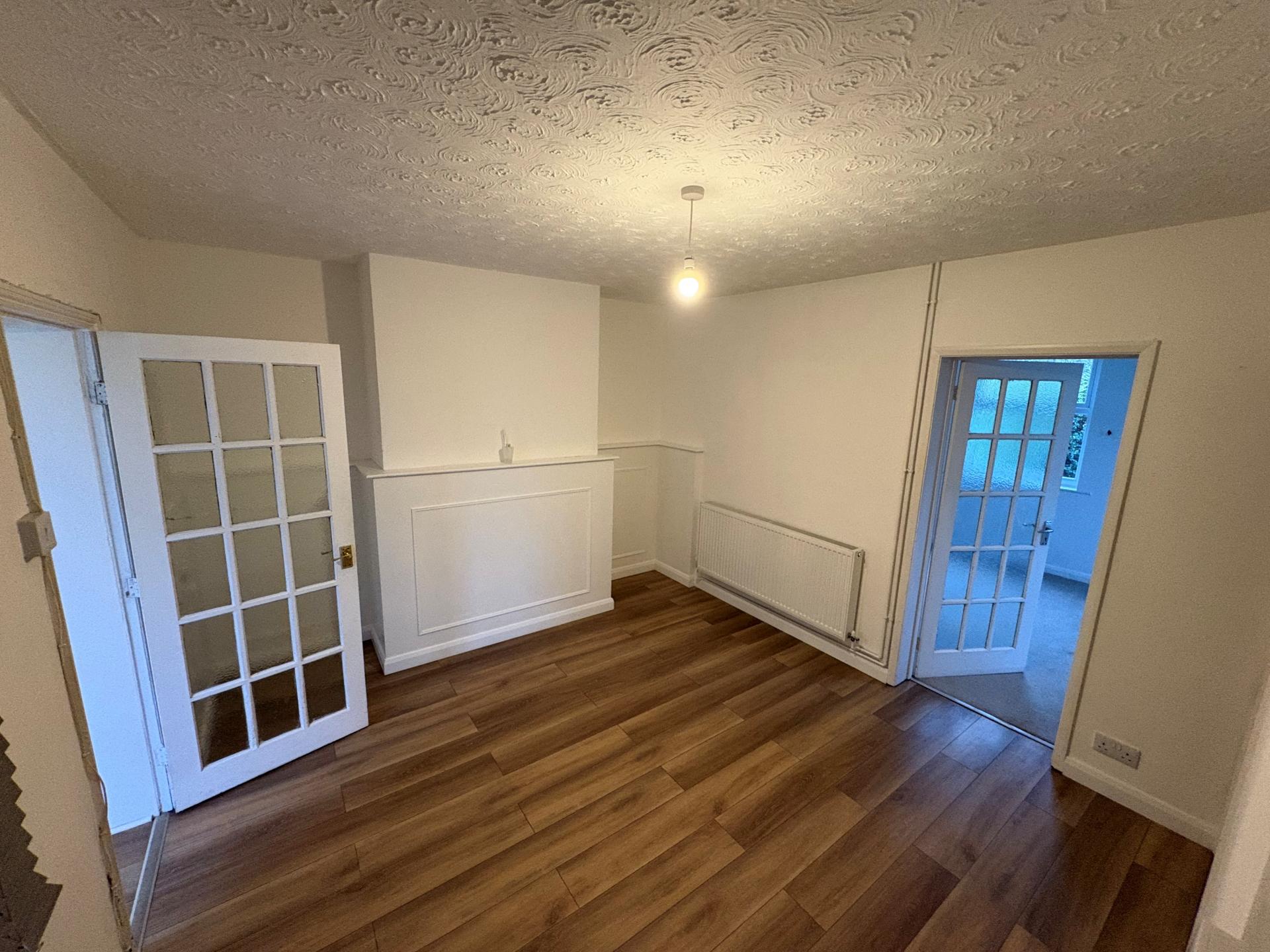 DINING ROOM 11' 6" x 10' 9" (3.52m x 3.29m) plus twin alcoves, radiator, textured ceiling, ceiling light, UPVC window to the rear elevation with fitted blind, walk-in understairs store cupboard, multi pane glazed door to: