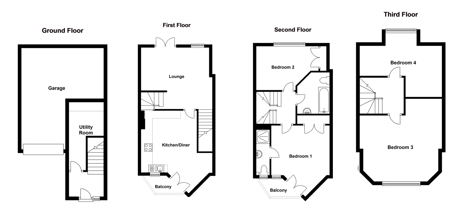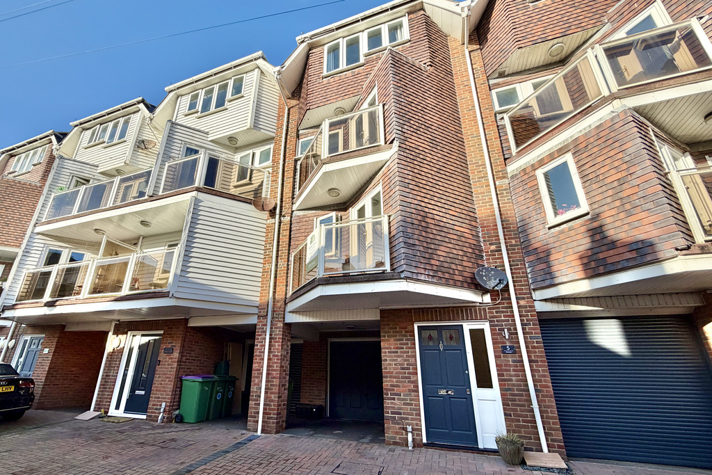 A well-presented four bedroom four storey modern townhouse residence with sea views from the top floor, ideally situated in a central location within easy walking distance of Sandgate’s shops, bars and restaurants as well as the beach and seafront promenade. Tucked away behind the high street, the property benefits from off-road parking for two cars as well as a good-sized garage. The accommodation is arranged over four floors with a utility room to the ground floor; a kitchen/diner and living room to the first floor; two bedrooms, en suite shower room and a separate bathroom to the second floor; and a further two bedrooms to the third. In addition there are balconies off the kitchen and master bedroom to the front, and a small terrace to the rear off the living room. The top floor front bedroom also enjoys sea views over the rooftops of the surrounding properties. Available with no onward chain, an early viewing is considered essential.