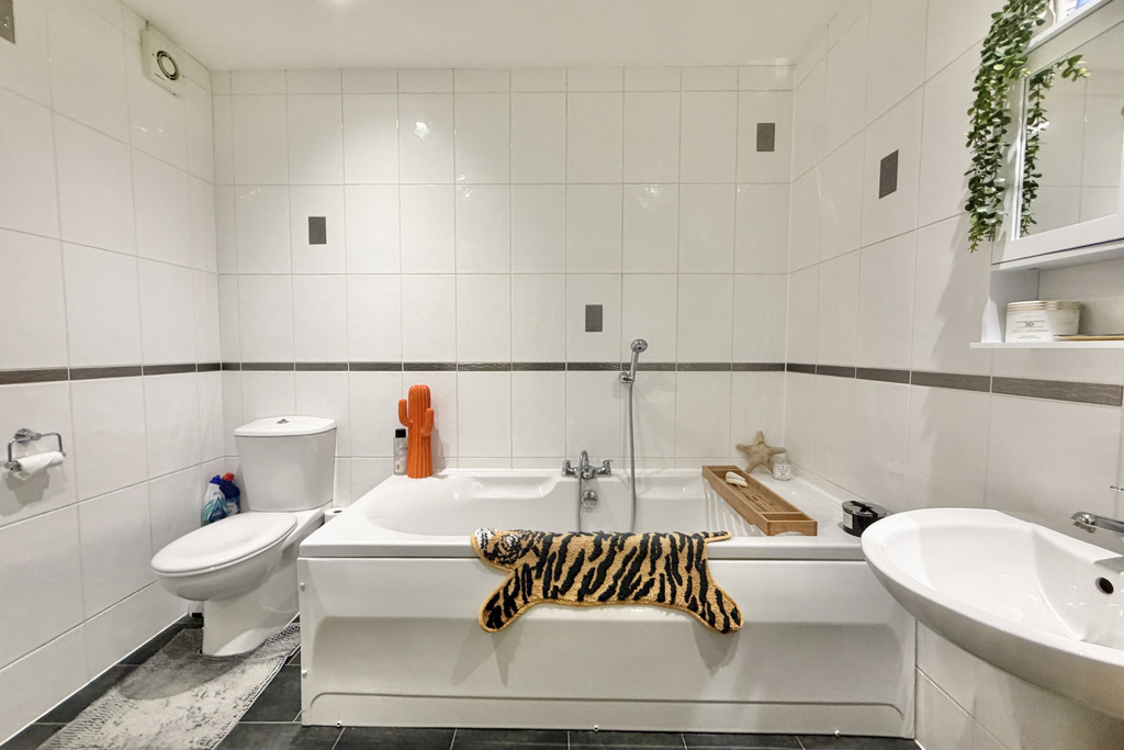 with tile effect vinyl flooring, tiling floor to ceiling, WC, panelled bath with mixer taps over and separate hand attachment, stainless steel towel radiator, hand basin with mixer taps over