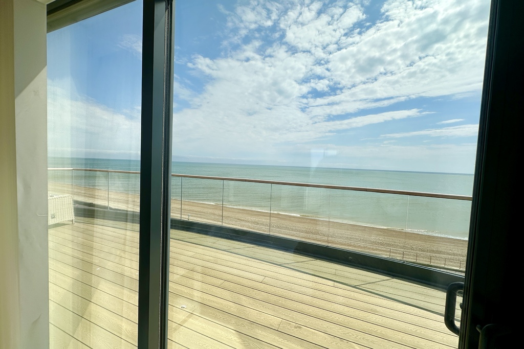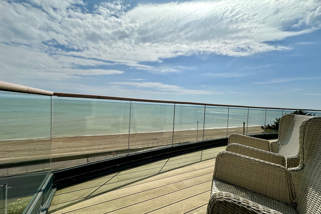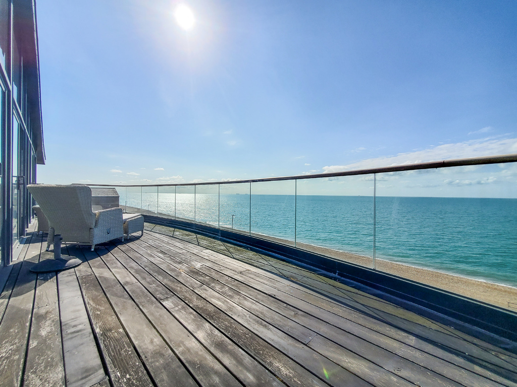 with wood flooring, glazed balustrade with wooden handrail over, stunning panoramic sea views across the English Channel to France
