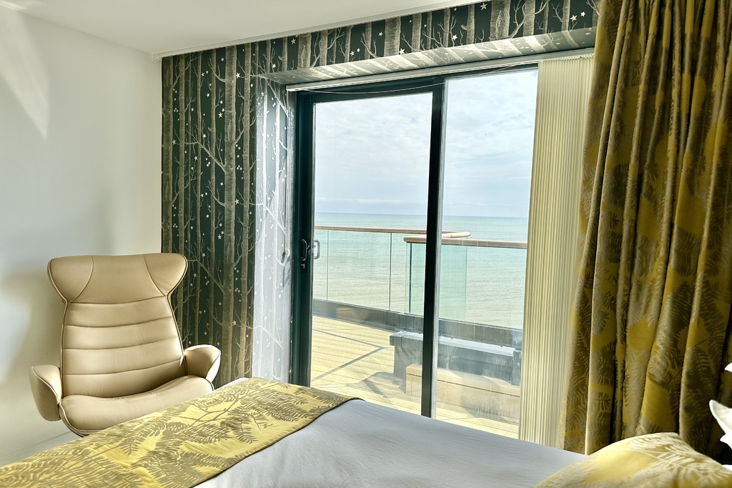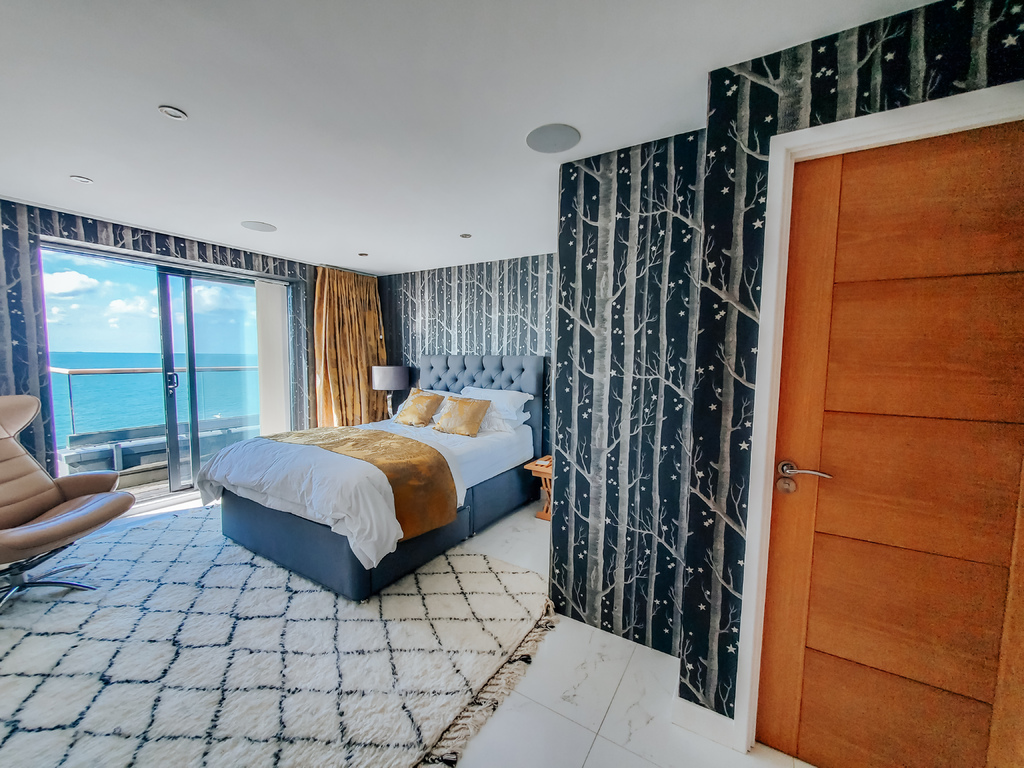with modern tiled flooring, aluminium frame triple glazed sliding doors leading out onto terrace with panoramic sea views across the English Channel to the French coastline, built-in wardrobes with hanging rail and shelving over, walk in wardrobe with hanging rail, drawers and shelving, ceiling speakers, thermostat