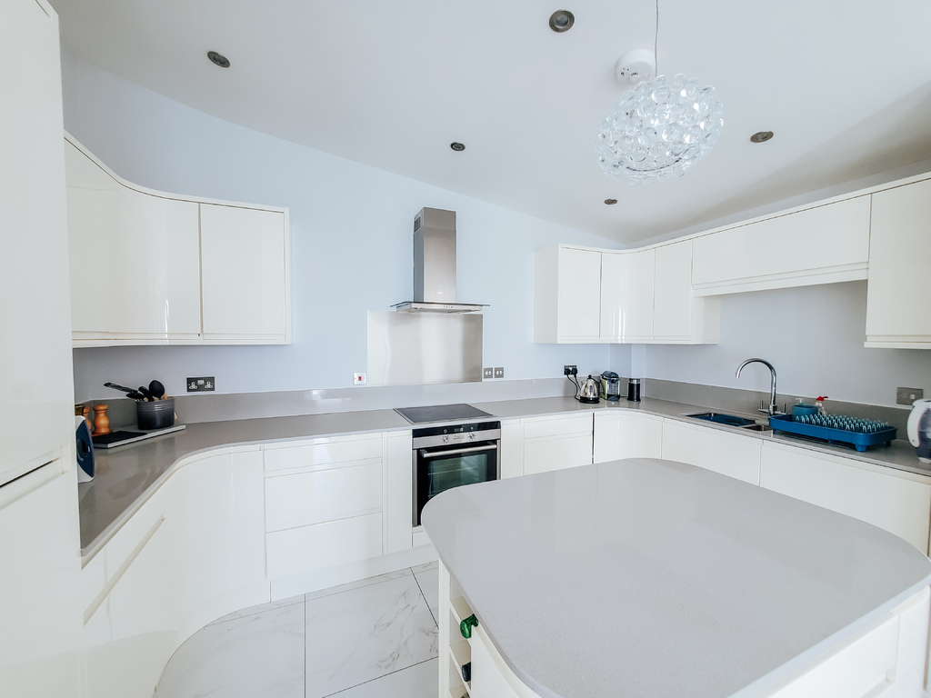 with modern tiled flooring, mixture of high and low level quality Umbermaster kitchen cabinets, stone worktops with matching upstands, integrated Siemens fan assisted oven, stainless steel splashback integrated Siemens four ring induction hob with extractor fan over, inset 1 1/2 bowl stainless steel sink with mixer taps over, integrated Siemens dishwasher, integrated tall fridge/freezer, freestanding island with storage under & wine racks to side