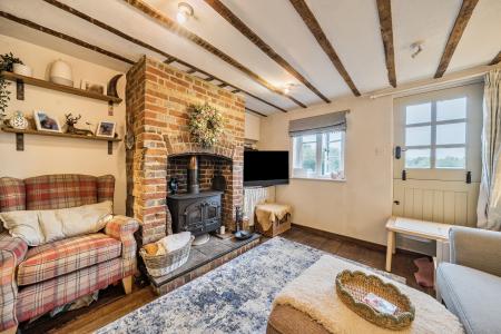 LOUNGE: Good space for lounge furniture and entertaining, good areas of exposed floorboards, electric radiator, various media points. Areas of exposed beams to the ceiling, exposed brick chimney breast with inset cast iron wood burner. Areas of fitted shelving to one side of the chimney breast and areas of exposed wood work to the ceiling. Double glazed windows to the front. Step leading up to: