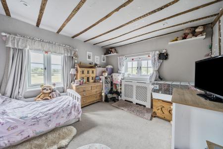 BEDROOM: Carpeted, good space for a king size bed and associated bedroom furniture, wall mounted electric radiator. Areas of exposed woodwork and areas of sloping ceiling. The ceiling runs to a higher, vaulted apex. Georgian style double glazed window to the front with a fitted roller blind and double glazed Georgian style double glazed windows to the side with fitted curtains. Areas of exposed brickwork.