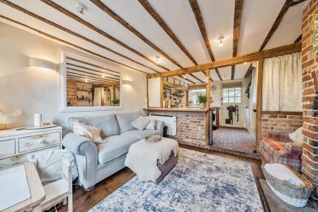 KITCHEN: This is open plan to the lounge. Raised brick floor. Fitted with painted oak base units and a complementary tiled work surface. Inset one and a half bowl ceramic sink with mixer tap over. Space for a freestanding electric oven with extractor hood over, space for washing machine, dishwasher and fridge/freezer. Areas of fitted shelving and areas of exposed woodwork to both walls and ceiling. Good areas of general storage and understairs storage with recently fitted cupboards. Double glazed Georgian style window to the rear with fitted Roman blind. Partially glazed stable door with Georgian style glazing to the upper half and Roman blind leading to the rear with inset cat flap.