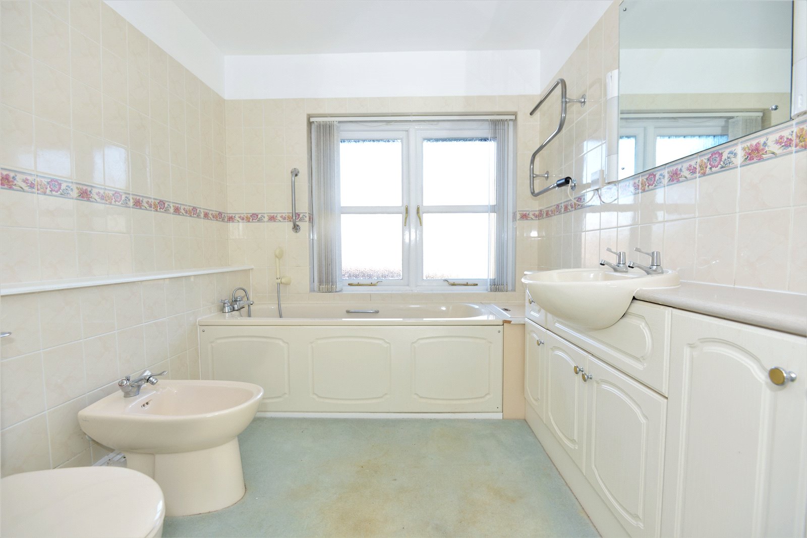 Bathroom Panelled bath with shower attachment. Wash hand basin inset to vanity unit with cupboards under. WC. Bidet.