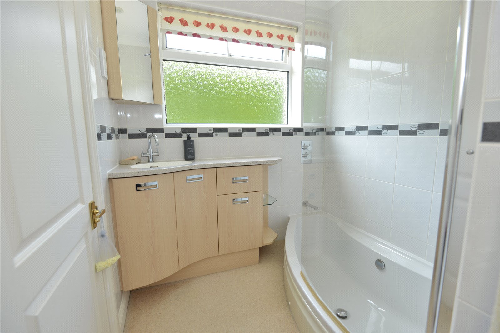 Ensuite Bathroom Recessed bath with shower over. Wash hand basin inset to vanity unit with cupboards under. WC. Heated towel rail.