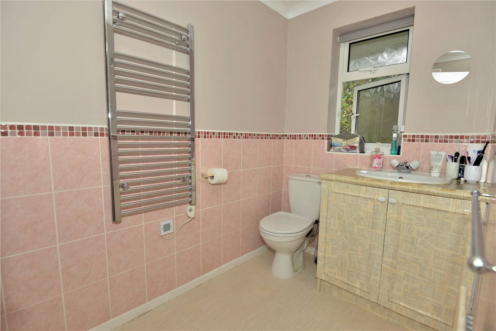 Ensuite Shower Room Shower cubicle with bi-folding door. Vanity basin with cupborad under. WC. Half-tiled walls.