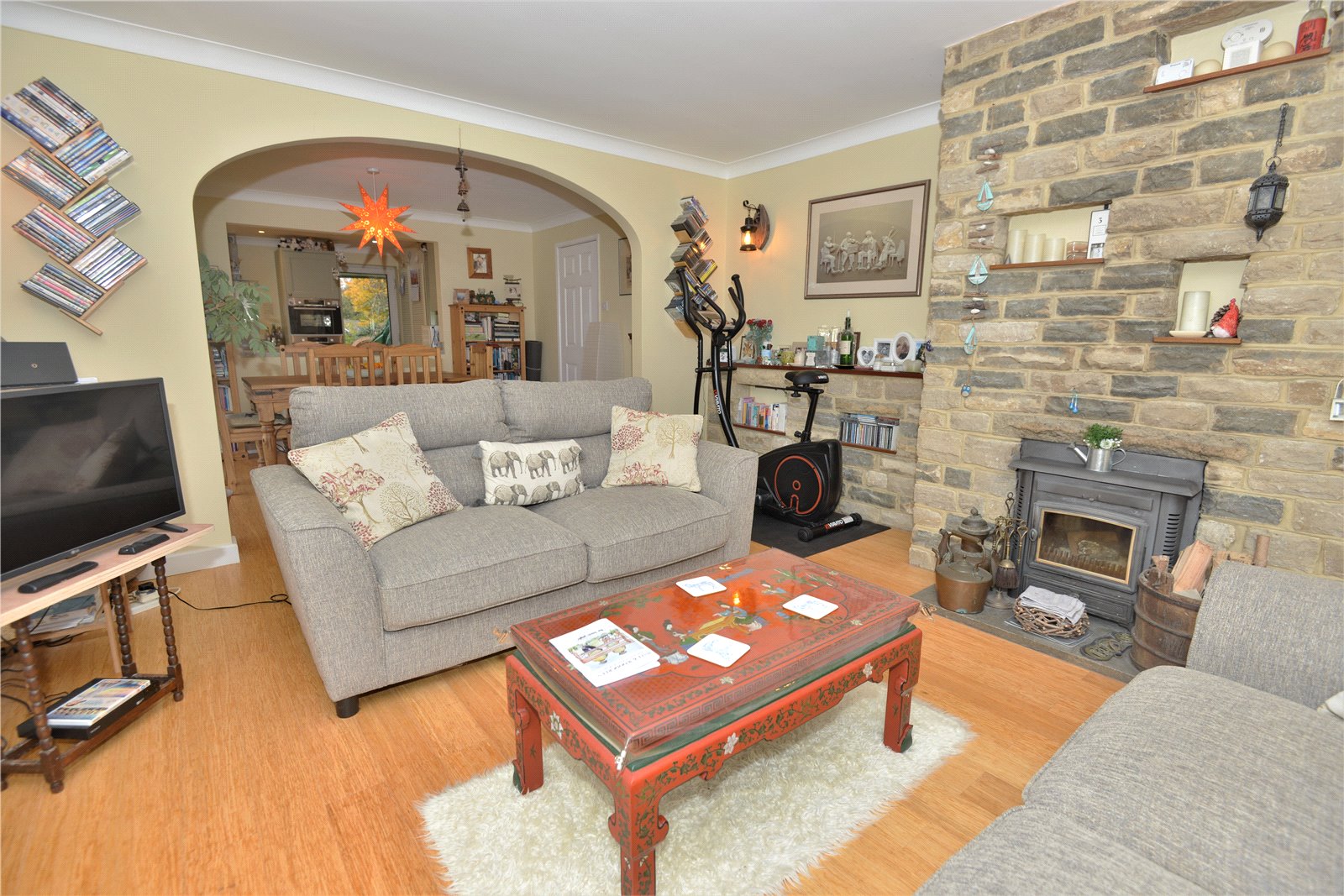 Sitting Room Double glazed windows with outlook to garden and views beyond. Stone fireplace with inset woodburning stove. Bamboo wood flooring. Arch through to:
