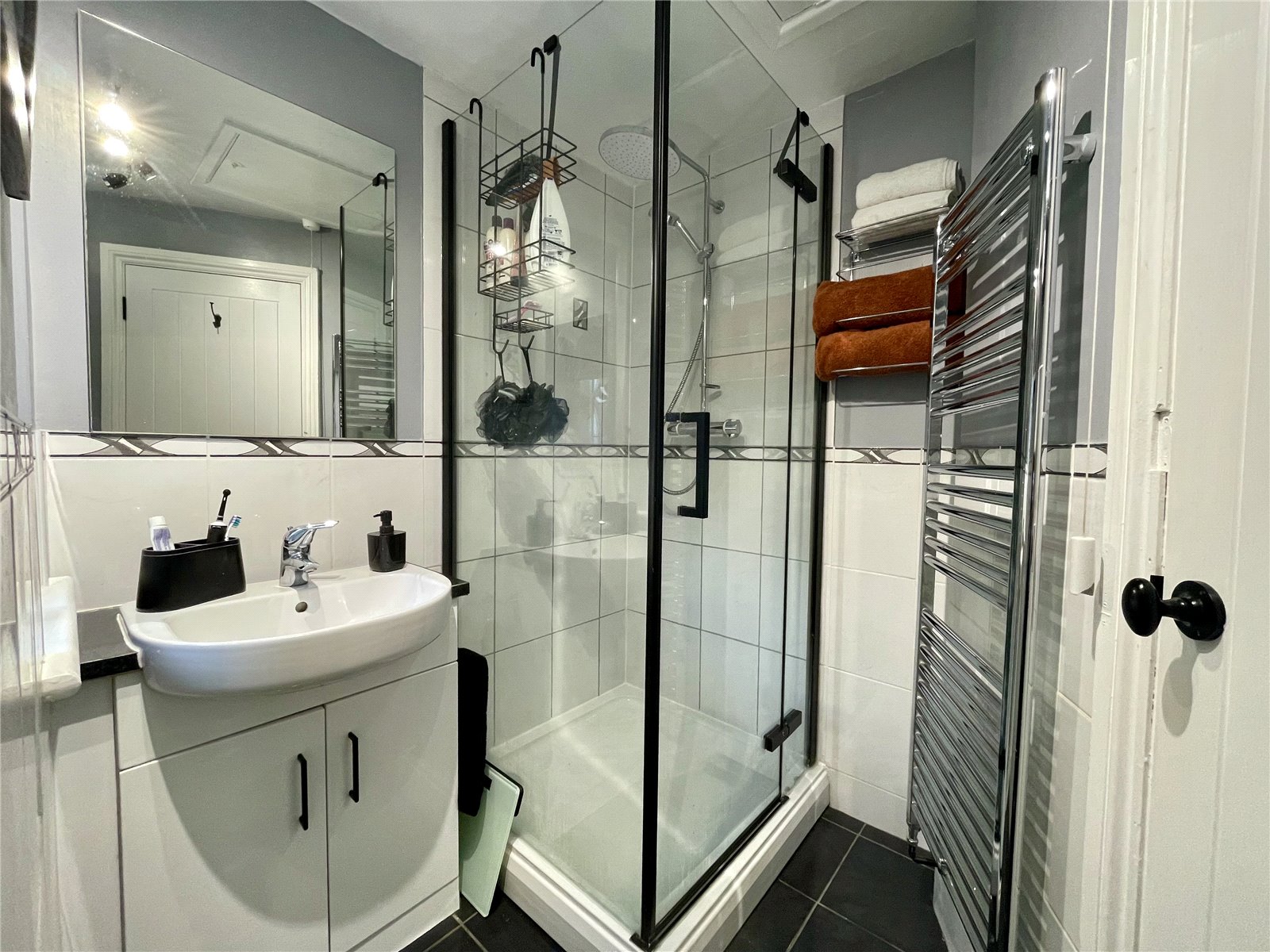 Shower Room Tiled shower cubicle. Wash hand basin with cupboard under. W/C. Chrome heated towel rail. Roof access.