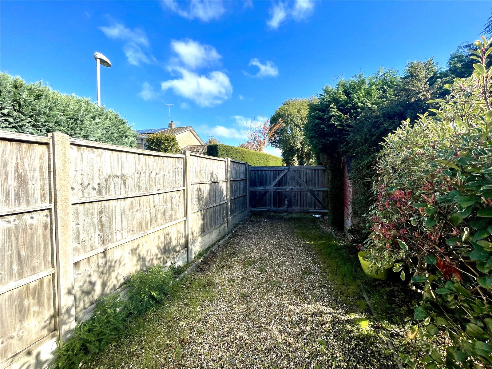 From Hayters Way a gravel driveway leads to the front of the house, supplying parking for 2 - 3 vehicles. The driveway is flanked by lawn and a mature oak tree. There is pedestrian side access to the rear garden, which is laid to a patio area and lawn with mature trees and hedging. There is a very useful, secondary vehicular access via Windsor Way where a pair of wooden gates open onto a further gravelled driveway with parking for 2 vehicles or a larger vehicle, such as a motor home. The driveway leads to an attached SINGLE GARAGE with an electric roller door and power and light connected.