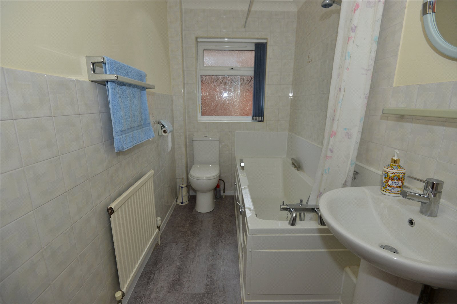 Bathroom Panelled bath with mobility access and shower over. WC. Wash hand basin.