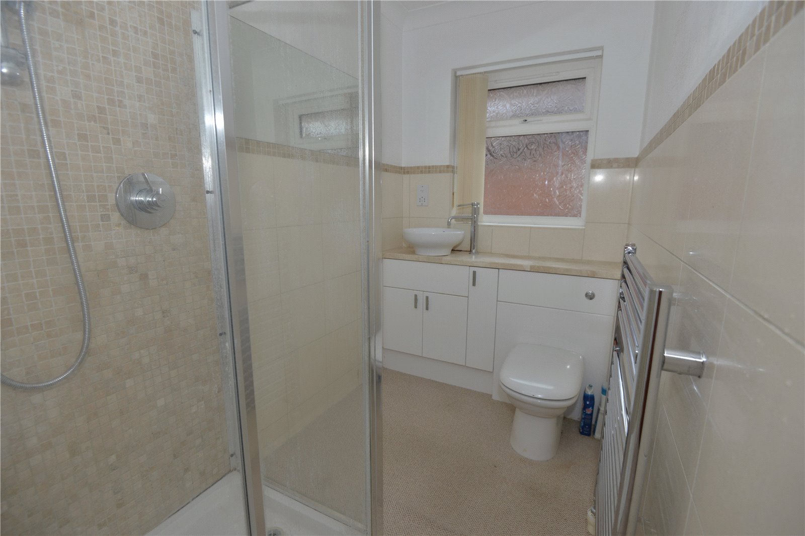 Ensuite Showeroom Tiled shower cubicle. Wash hand basin inset to vanity unit with cupboards and drawers under. WC. Chrome heated towel rail.