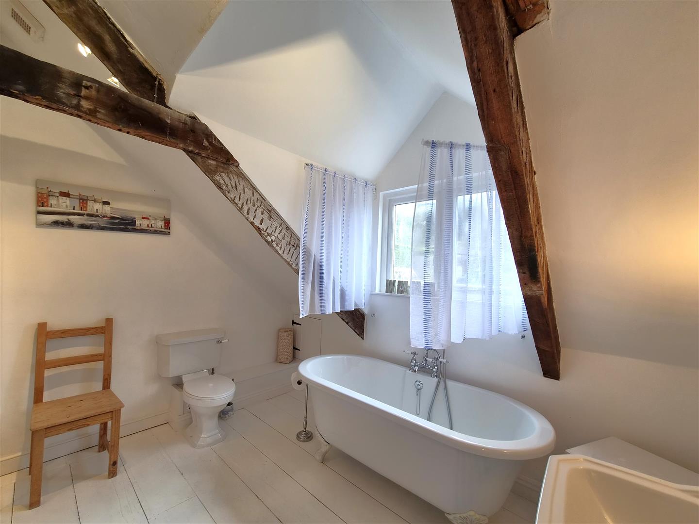 Another door opens to a spacious and appealing bathroom with wooden floor and exposed beams. A large window offers natural light and there is a free standing bath with separate large shower cubicle, WC and wash hand basin.