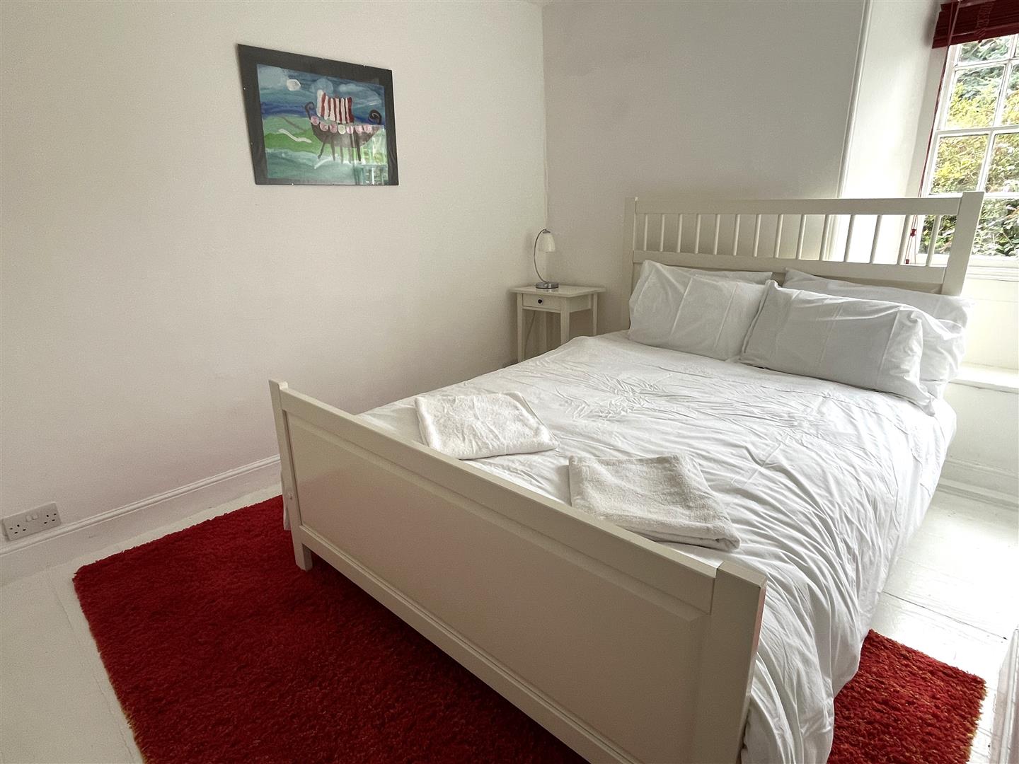 Stairs lead to the second floor landing with a window and pretty views over roof tops to the harbour. A door opens to a further double room with exposed beams and wooden floor, Velux windows.